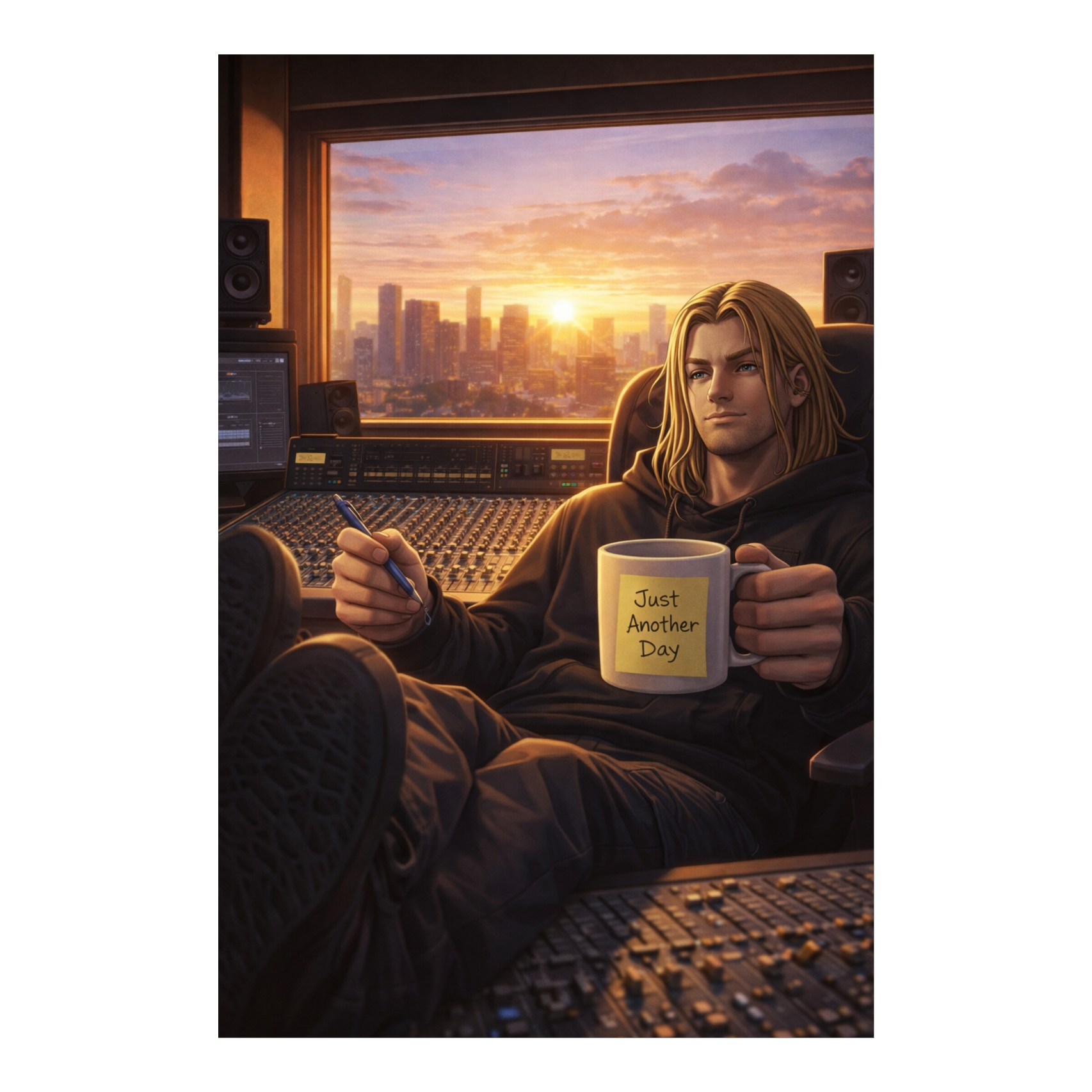 VOCALS: Male rap only, relaxed but confident flow, clear storytelling voice, Slightly melodic hook but gritty, INSTRUMENTATION: Piano loop (Dre style), heavy kick drum, snapping snare, deep rolling bassline, background sounds of city life (sirens, traffic) low in the mix, MOOD: Chill, Confident, Routine, Hustle