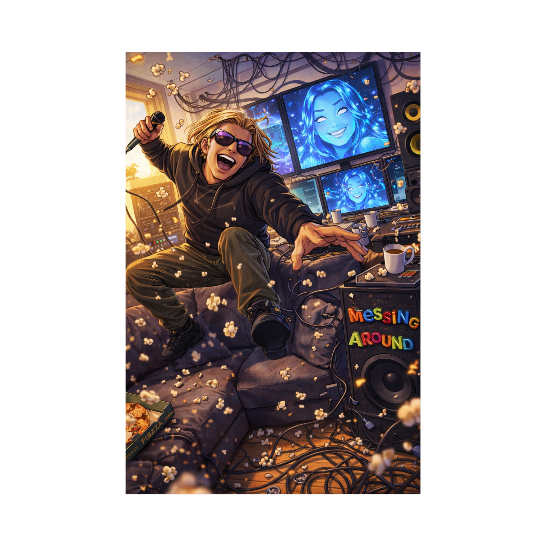 VOCALS: Male rap, very playful, changing pitch and voices (deep/high), laughing between lines, Relaxed flow, INSTRUMENTATION: Bouncy bassline, scratching sounds, bright piano chords, cartoon sound effects (boings, whistles), heavy snare but bouncy rhythm, MOOD: Playful, Funny, Loose, Creative