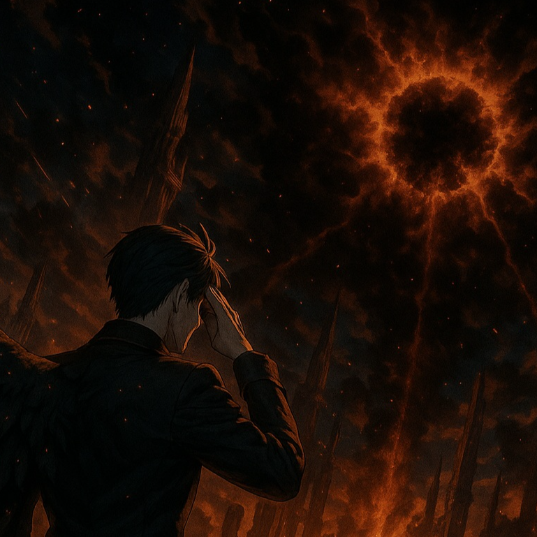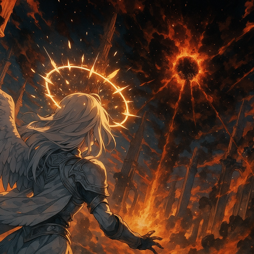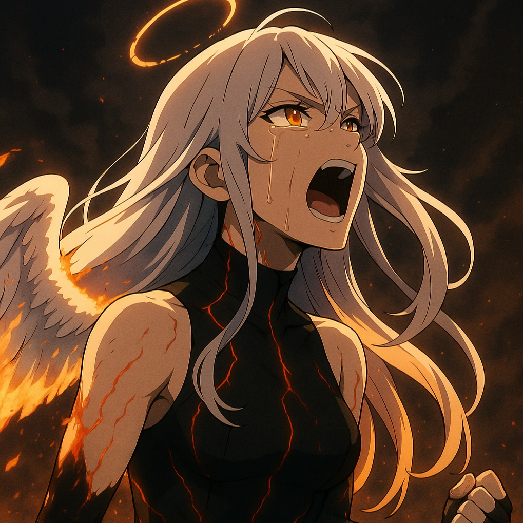Cinematic melodic death metal with angelic and orchestral build-up, Starts ethereal with soft choir and clean guitars, evolving into heavy distorted riffs and layered harsh female vocals, Vocals shift from pure cleans to false-cord growls and back, mirroring the angel’s fall from light to flame, Features dynamic tempo changes, haunting choirs, orchestral strings, and a burning atmospheric breakdown, Ember’s dragon motif enters mid-song through low drum reverbs and fiery sound design, Ends with calm, ambient guitars and whispered cleans, Tone: tragic, divine, apocalyptic, emotional