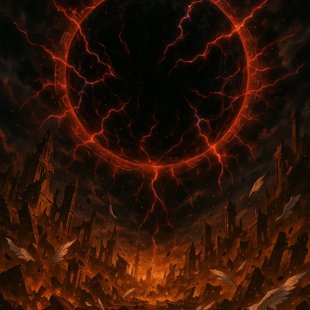 Brutal, cinematic death metal with blackened and industrial elements, Starts with cosmic ambience and distorted feedback before erupting into ultra-fast tremolo riffs, double-kick chaos, and layered harsh growls, Guitars duel in a relentless battle of melody and destruction, Midsection introduces mechanical whispers and reversed choirs to symbolize the unseen controller behind the dark star, Intensity peaks in a melodic vs dissonant solo duel before collapsing into droning distortion and silence, Tone: apocalyptic, violent, mechanical, mythic — the sound of creation’s annihilation through pure darkness