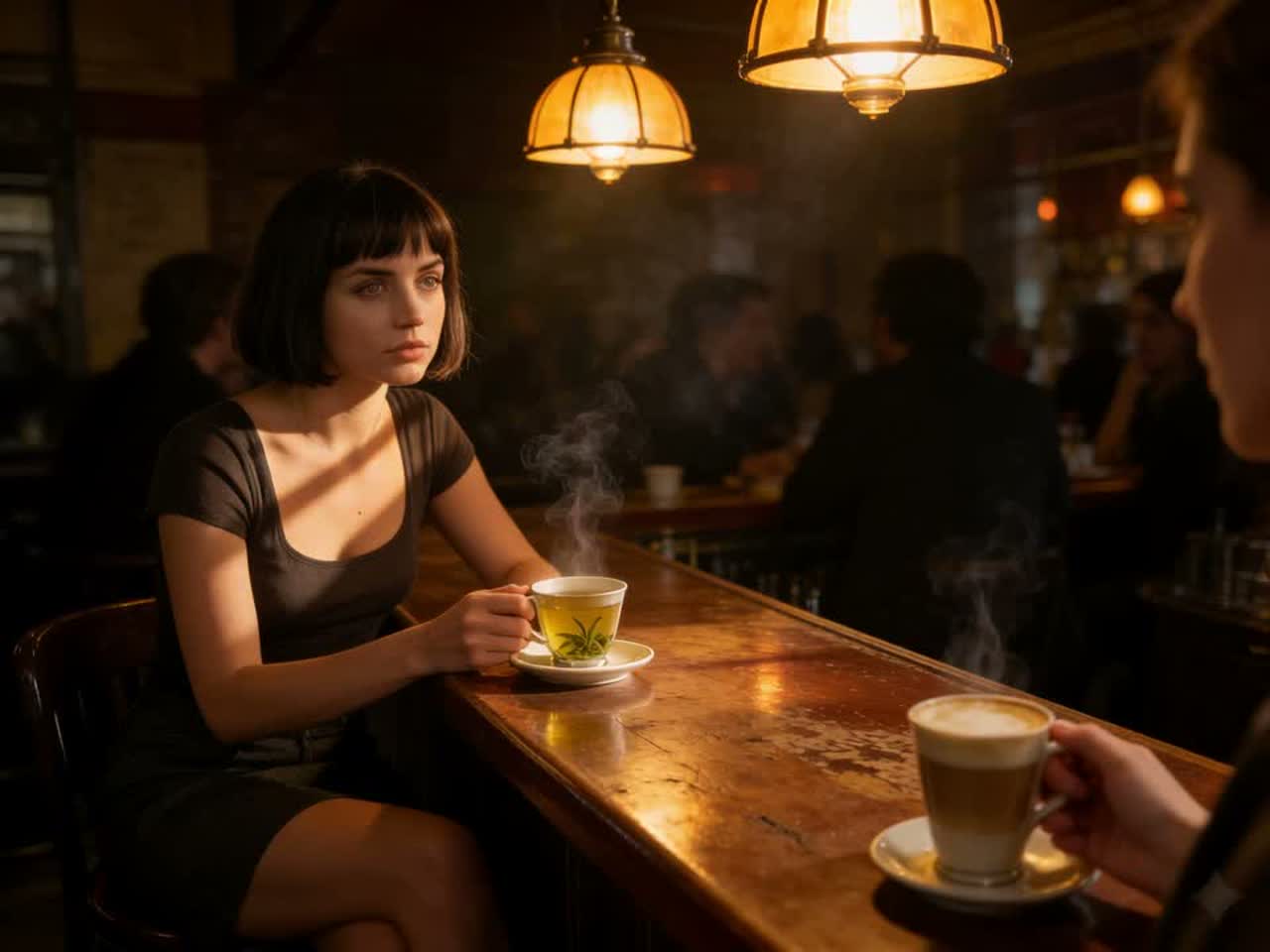 Late 90s French lust dark pop, intimate café heartbreak, female vocals with French accent, melancholic but controlled delivery, 95-100 BPM, 4/4 time, Verses: sparse arrangement, acoustic guitar or clean electric guitar with reverb, subtle synth pad, intimate close-miked vocals, Chorus: minimal build, maybe layered vocals but restrained, bossa nova-influenced rhythm, Verse 2: production stays intimate even as emotional weight increases, Bridge: stripped down moment, just voice and minimal instrumentation for "mirror mirror" confession, then gentle rebuild, Final chorus: same restraint, no cathartic explosion, just resignation, Production: warm but distant, dark café jazz influence, fingerpicked guitar or Rhodes piano, brushed drums or minimal electronic percussion, sophisticated restraint, the production should feel like watching someone end a relationship politely in public, everything held in, French torch song meets bedroom pop