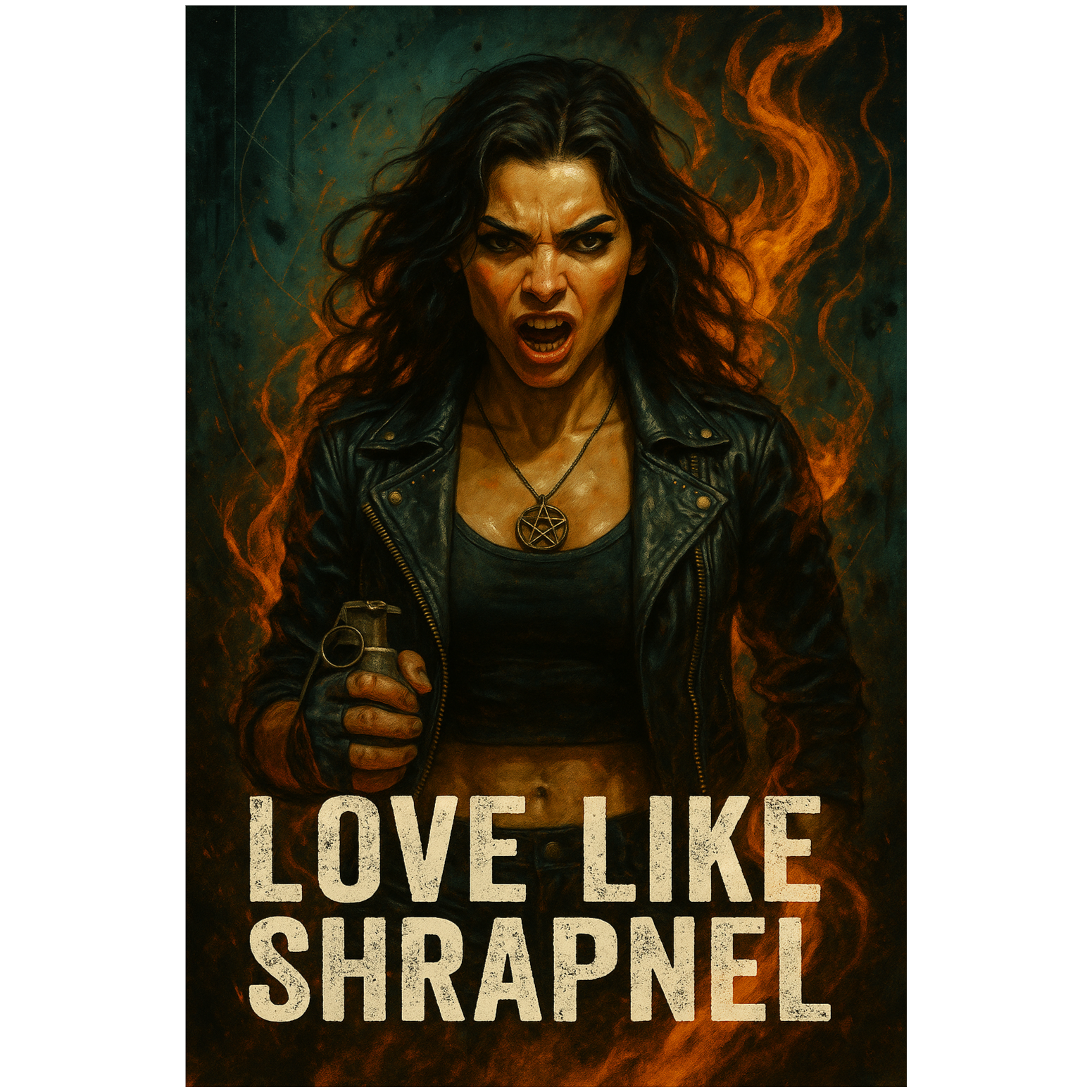 Grunge + industrial + Bollywood fusion, 85–90 BPM, minor key, Dual-layer female vocal — smoky, dominant, raw — shifting between sultry restraint in the verses and explosive growl in the choruses, Deep distorted bass and metallic percussion drive the pulse; layer dhol, tabla, and low taiko for ritual heartbeat energy, Verses: tight, intimate, percussive with breaths and snarled whispers, Pre-chorus: tension builds through filtered drums and low drones, Chorus: full detonation — distorted guitars, thunderous percussion, stacked vocals chanting “Love like shrapnel, ” Bridge: tempo holds but everything drops to bass + breath before erupting again in the final chorus, Add subtle sitar bends and cinematic synth pads for mystic shimmer, Mood: primal, erotic, explosive — a love that’s both ignition and aftermath