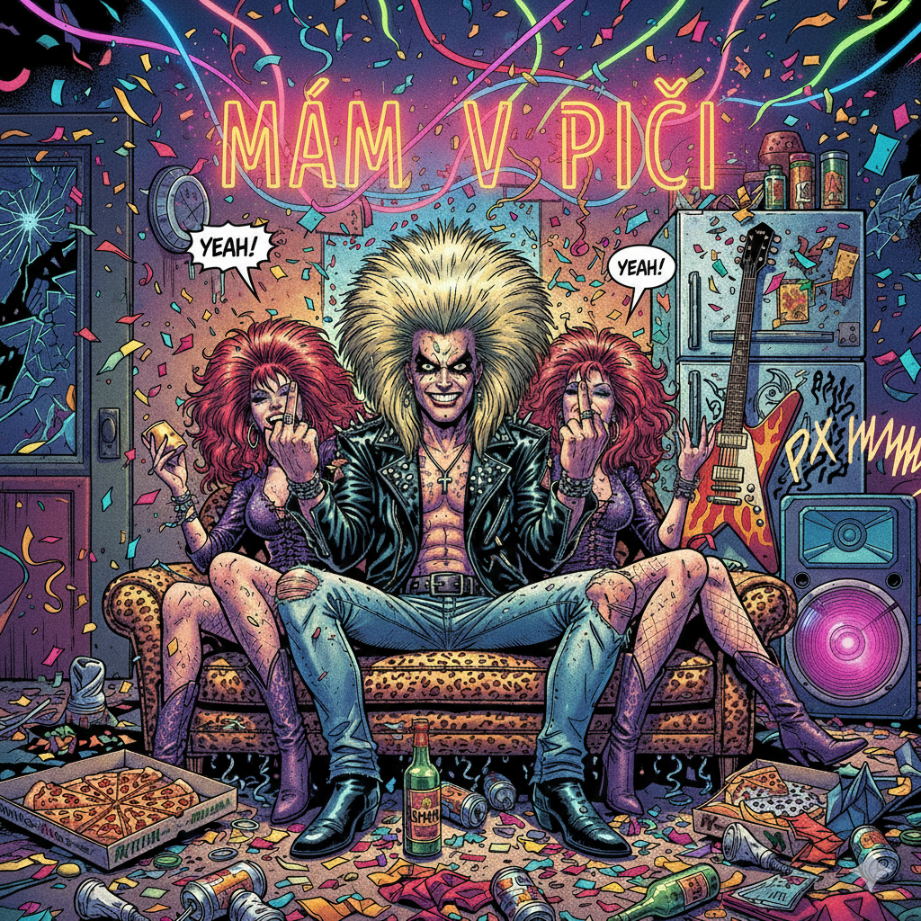 Energetic Czech rock parody with heavy guitars, pounding drums and a bold dominant attitude, Strong female vocals with sarcastic, commanding delivery, Gritty bassline, sharp guitar riffs, occasional squealing bends, and dynamic rock breaks, Dark humor and theatrical rock presence, slightly over-the-top, rebellious, confident and provocative, Keep the chorus explosive and punchy, with gang-shout harmonies and crunchy power chords, Whole track feels like a parody rock anthem with dominant charisma, 📊 Tempo: 132–142 BPM