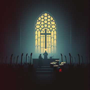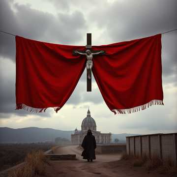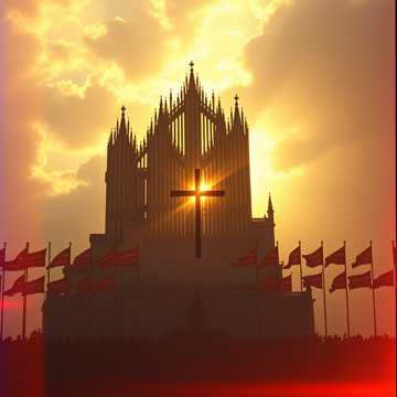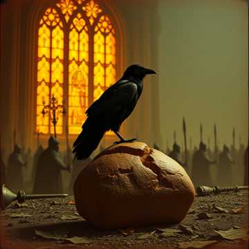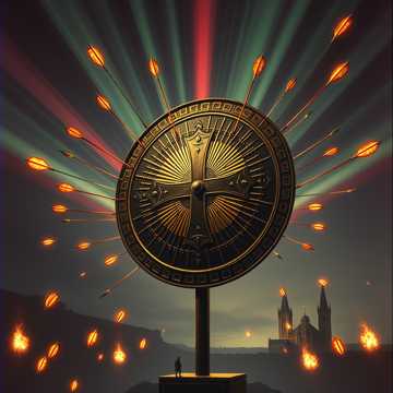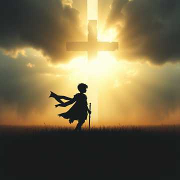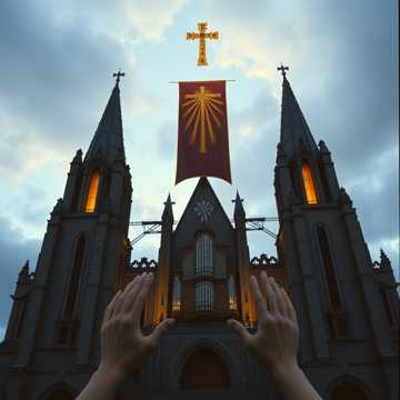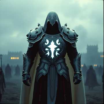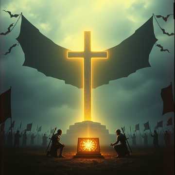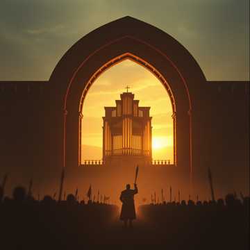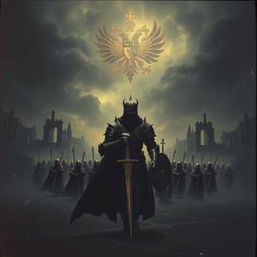 Epic Christian crusader heavy metal, powerful fusion of authentic Gregorian monk chants and modern extreme metal: aggressive groove riffs, triumphant war-metal choruses, dark progressive melancholy, thunderous downtuned guitars, relentless double-kick drums, soaring deeply melodic clean male vocals with occasional brutal growls, medieval classical instruments (solemn pipe organ, haunting lute, recorder, hurdy-gurdy, handbells), huge Latin male choir, dramatic slow doom marches exploding into galloping riffs, cinematic battlefield atmosphere, themes of holy war and divine judgment, male voices