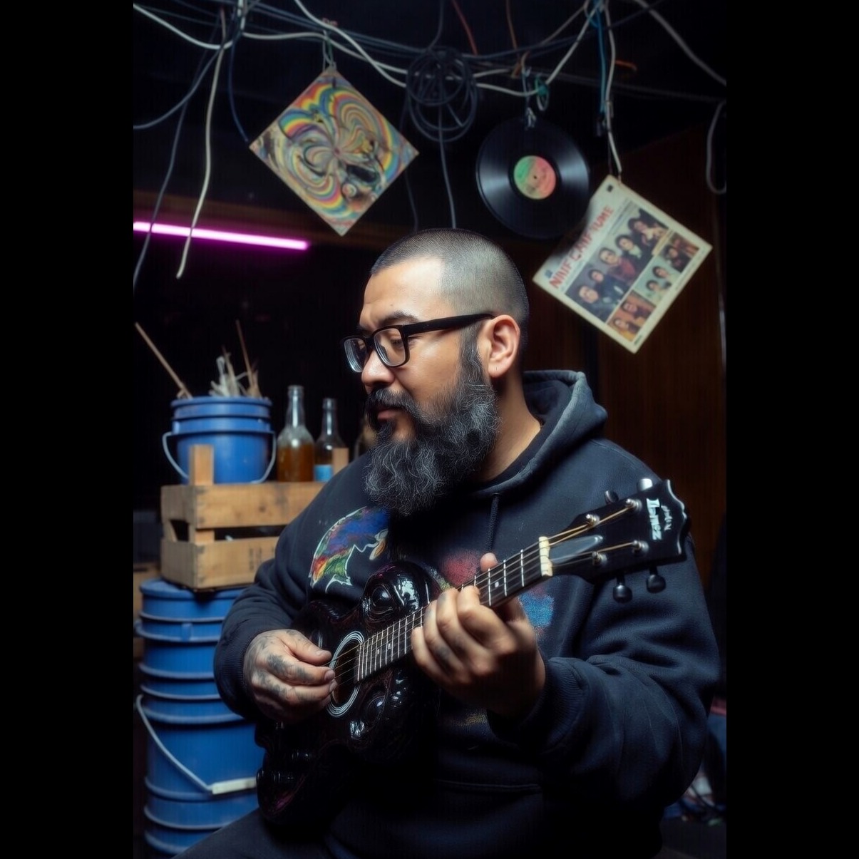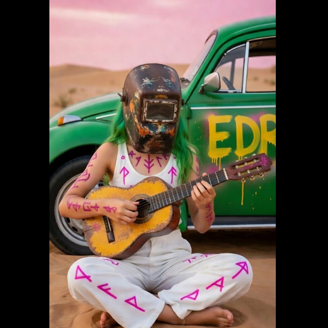 "Cyber-shamanic glitchwave, Spanish guitar fractal solos, industrial cumbia beats, AI throat-singing in reverse Latin, eerie theremin hymns, 'Silicon roots hum, timeβs accordion screams, ' QR chorus, "