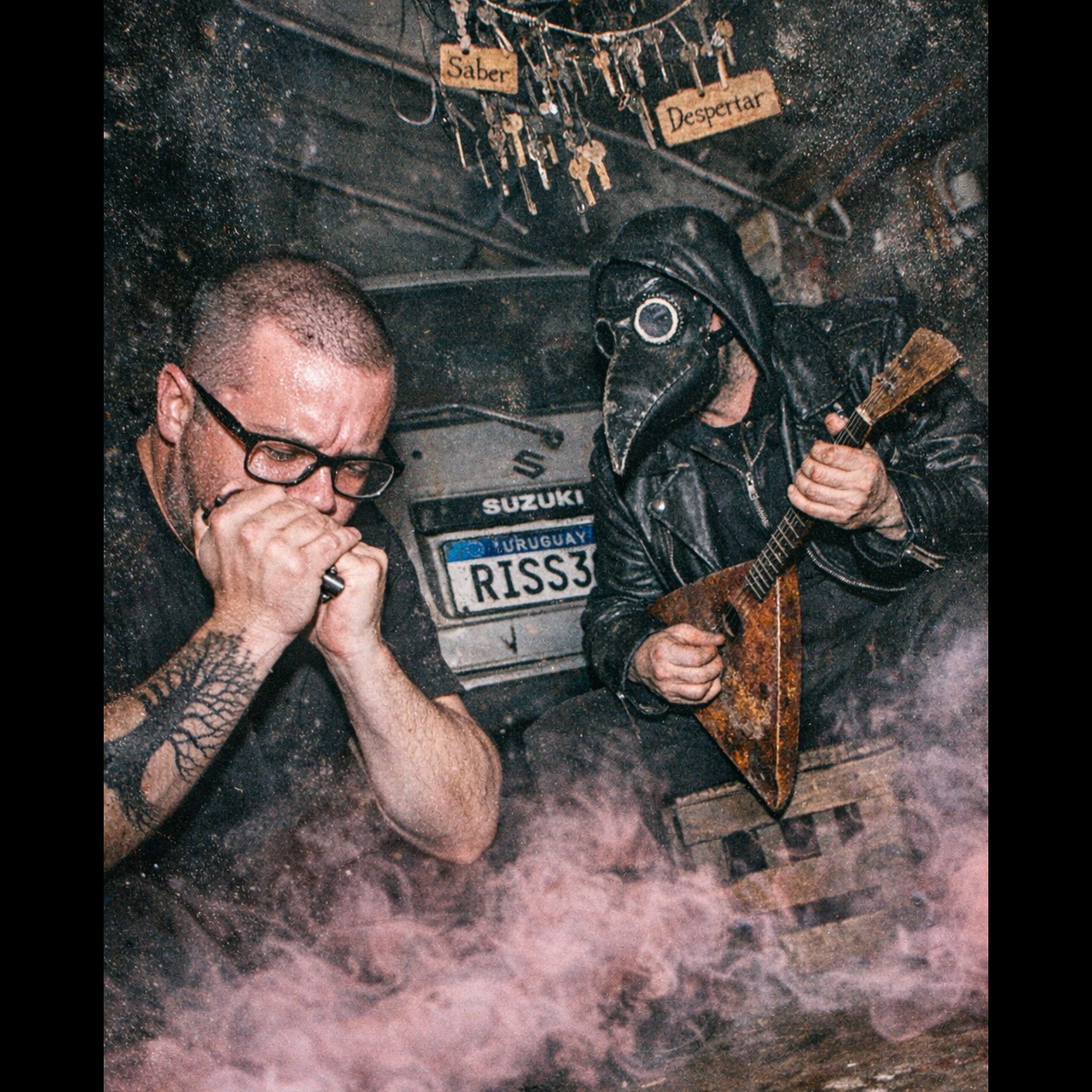 Virtuoso Junk Balalaika (fast hypnotic tremolo), Dirty Garage Blues, 95 BPM, Deep Russian Cinematic Humming (Slavic baritone, non-verbal), Heavy Boot Stomps, Car Hood thuds, "Llave-fono" (keys clinking), Deep One-string Oil-can Bass, High-contrast 90s production, Studio Unplugged-Raw, hypnotic "Mental Gum" Slavic-Rioplatense fusion