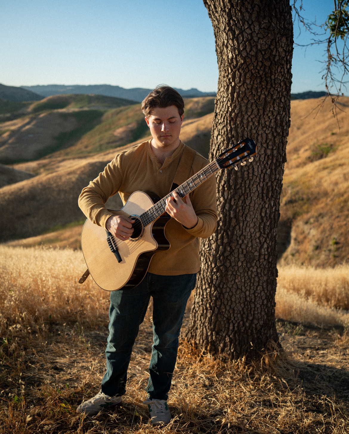 Acoustic folk-pop song in 4/4 time at a moderate tempo of 100 BPM, in the key of E major, The instrumentation features a male lead vocalist, acoustic guitar, bass guitar, and drums, The acoustic guitar provides a consistent strumming pattern throughout, establishing the harmonic foundation, The bass guitar plays a supportive role, outlining the root notes of the chords, The drums enter during the chorus sections, providing a light, rhythmic pulse with a focus on kick and snare, The male lead vocalist sings with a clear, emotive tone, utilizing a relatively narrow vocal range, The song structure follows a typical verse-chorus format with a bridge and outro, Production is clean and balanced, with the vocals prominent in the mix, Reverb is applied to the vocals and acoustic guitar, creating a sense of space, The overall mood is reflective and slightly melancholic