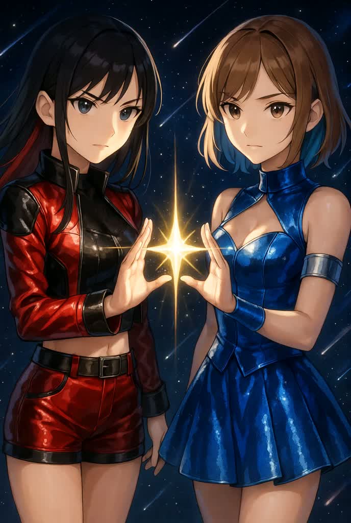 A digital hard rock track at 140 BPM opens with a glitchy synth riff, launching into verses driven by crushing guitars, dense synths, and sharp rhythm—MIYU’s husky vocals commanding, The pre-chorus swells with MEGU’s soaring harmonies and filtered layers, The chorus erupts in distorted guitars, pounding programmed drums, and layered, energetic vocal shouts, In the bridge, MEGU peaks with emotive melodic lines before a frenetic guitar-synth solo, The final chorus fully blends both voices and maximal textures, ending on synth echoes and a lingering vocal refrain, Fierce, defiant, and deeply hopeful throughout