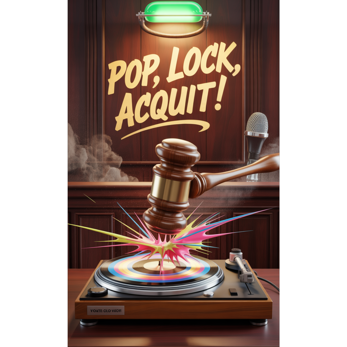 Breakbeat courtroom funk, Crisp drums, glitterstrike keys, 80s power brass, Cold-flow female rapper vs slick male rapper trading legal bars, Judge hype-man, 'Pop, Lock, Acquit!' hook, High-energy adversarial groove, A high-energy breakbeat track dripping with 80s synth-funk (glittery keys, bold brass), built around a courtroom battle where a sharp female rapper and a charismatic male rapper trade legal-themed bars over the iconic "Pop, Lock, Acquit!" hook, all presided over