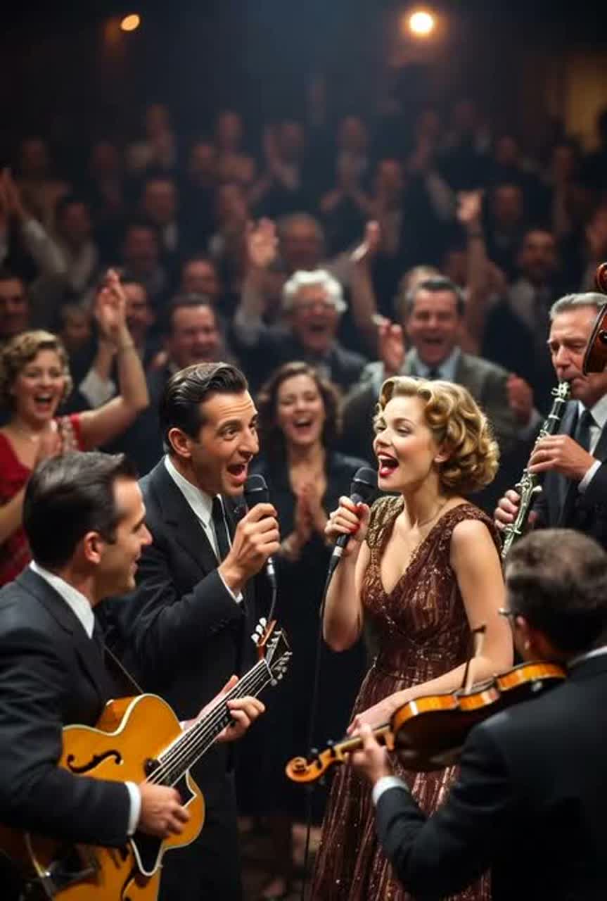 Live concert 1940s pure Big Band Swing Jazz wartime London Blitz style emotional contrast joy versus sorrow anthem, male-female duet vocals ultra melismatic authentic British English accents warm intimate crooner male and soaring emotional female big band style, brass section trompete tromboane dominant swinging, clarinet melodic lead weaving emotional, upright bass walking swing rhythm steady, drums brushes shuffle swing beat gentle explosive, piano stride swing runs playful emotional, authentic 1940s wartime production raw emotional depth bittersweet viral international, breathing audible realistic vocal runs ultra melismatic tender emotional endings, crowd dancing swaying clapping gentle romantic wartime energy, focus brass clarinet piano vocals authentic 40s big band swing emotional depth love loss courage dancing defiance bittersweet longing, ‑rock, ‑rock ballad, ‑modern elements, ‑EDM synths auto-tune electric guitars