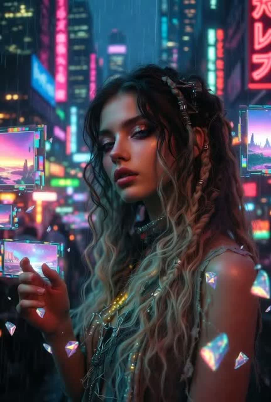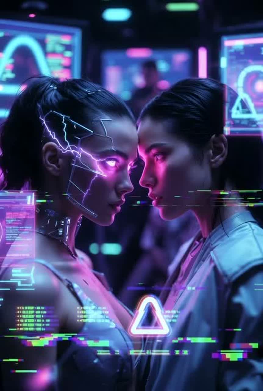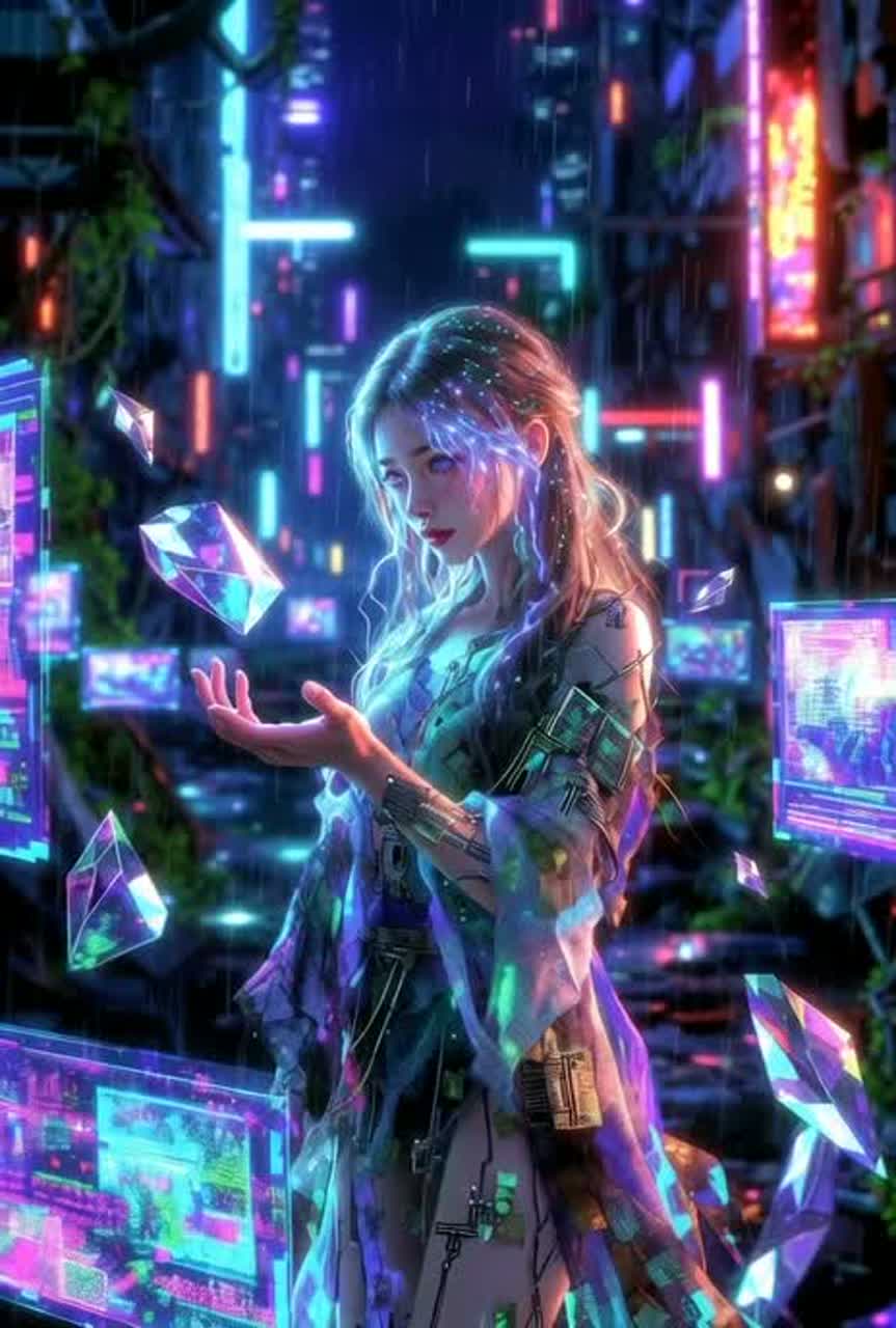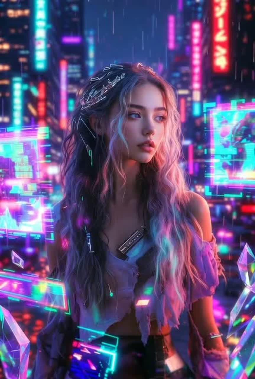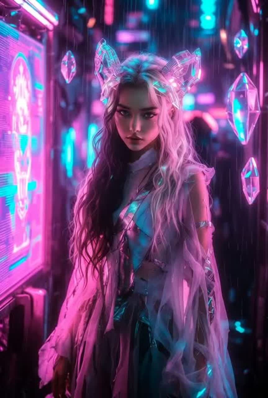 Dark futuristic techno with heavy EDM energy—relentless driving four-on-the-floor kick, deep sub-bass, razor-sharp synth leads, glitchy effects and digital distortion throughout; dominant vocoder-processed ethereal female vocals with chopped echoes and pitch shifts for alien seductive feel, building from glitchy static intro to massive euphoric drops; cyberpunk atmosphere with industrial percussion, holographic synth pads, and tense risers; tempo 128-135 BPM, focus on raw sensations of disorientation, electric awakening, and seductive power surge in a rainy neon megacity