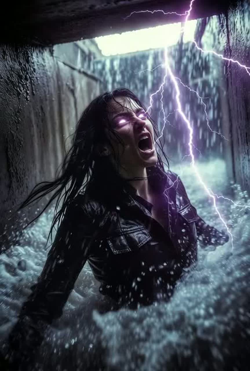 Furious elemental cyber-storm techno at 136 BPM—thunderous booming four-on-the-floor kick like lightning strikes, rolling surging sub-bass like floodwater, crackling synth lightning bolts slashing through the mix, storm FX with distant thunder rolls and wind howls; raw, howling female vocoder lead drenched in reverb and distortion, layered with choral storm howls and siren builds; atmosphere of abandoned storm drains—roaring runoff, concrete echoes, overhead lightning flashing through grates; focus on the visceral internal tempest—the rage of betrayal turning to cathartic power, grief flooding into defiance, the electric thrill of being recharged by the storm itself—dark, intense, elemental, unforgettable emotional release