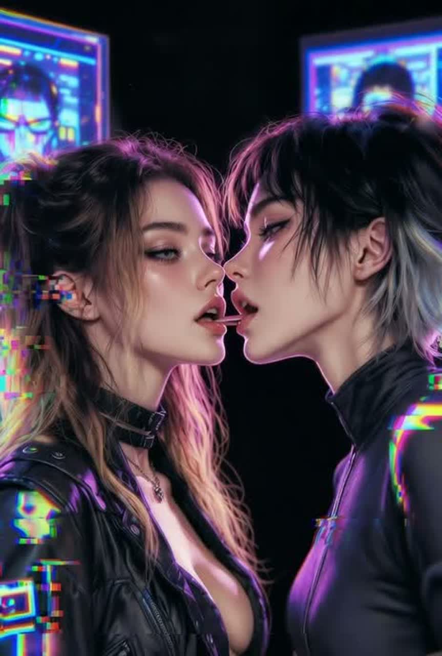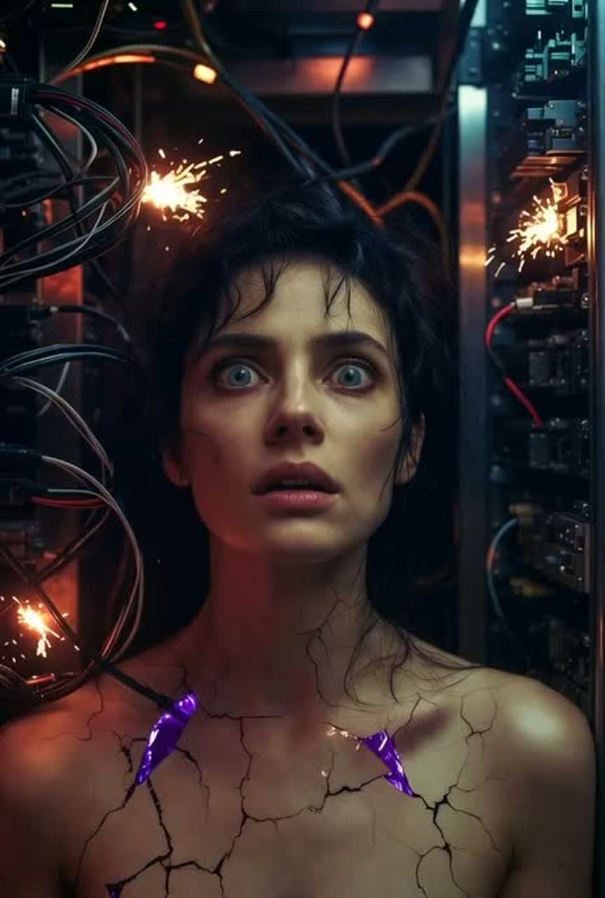 Hard cyberpunk techno at 132 BPM—aggressive pounding four-on-the-floor kick, thick squelching bass wobbles that grip and slide, glitchy chopped vocal moans as rhythmic percussion, razor-sharp synth stabs and wet distortion; dominant husky vocoder female lead with heavy processing, layered digital growls and ecstatic sighs; atmosphere of encrypted booth overload—static crackle, neural sync hum, rising heat and pressure; focus on deep, driving innuendo of interface, plugging in, riding the current, full-system override, and ecstatic crash—raw, sensual, power-drenched without crossing explicit lines, built for intense, body-moving drop