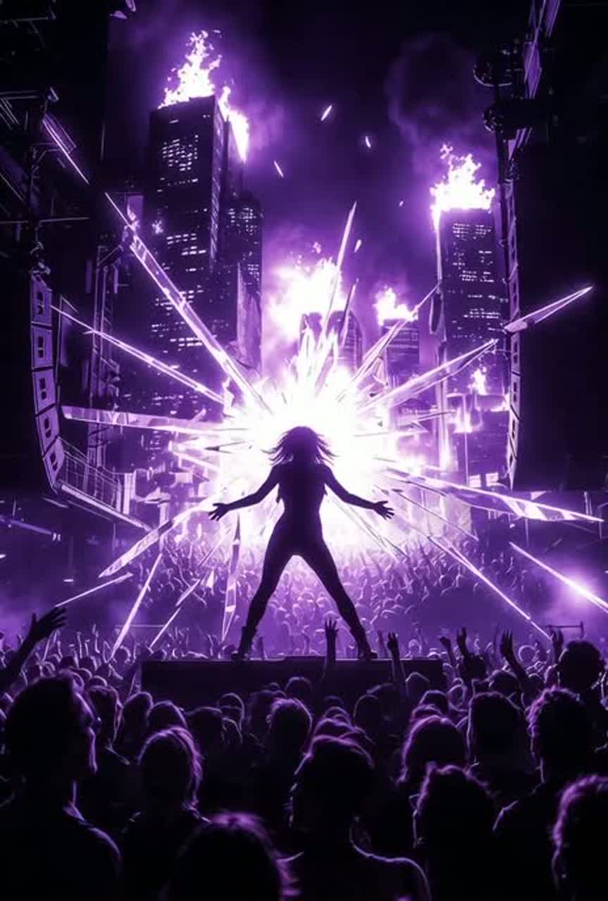 Massive peak-hour festival techno at 138 BPM—explosive four-on-the-floor kick that shakes foundations, wall-to-wall supersaw synth leads screaming upward, crushing sub-bass drops, huge crowd-chant vocoder layers, festival horn stabs, glitchy quantum shard effects throughout; powerful commanding female vocoder lead with distortion edge and echoing crowd responses; cyberpunk warehouse rave atmosphere—strobing lights, holographic skies, thousands of bodies in sync; focus on brazen, unapologetic power, shocking the world with raw presence, euphoric takeover, and the electric thrill of a queen reclaiming her fire in public—epic, anthemic, unforgettable chart-destroyer energy