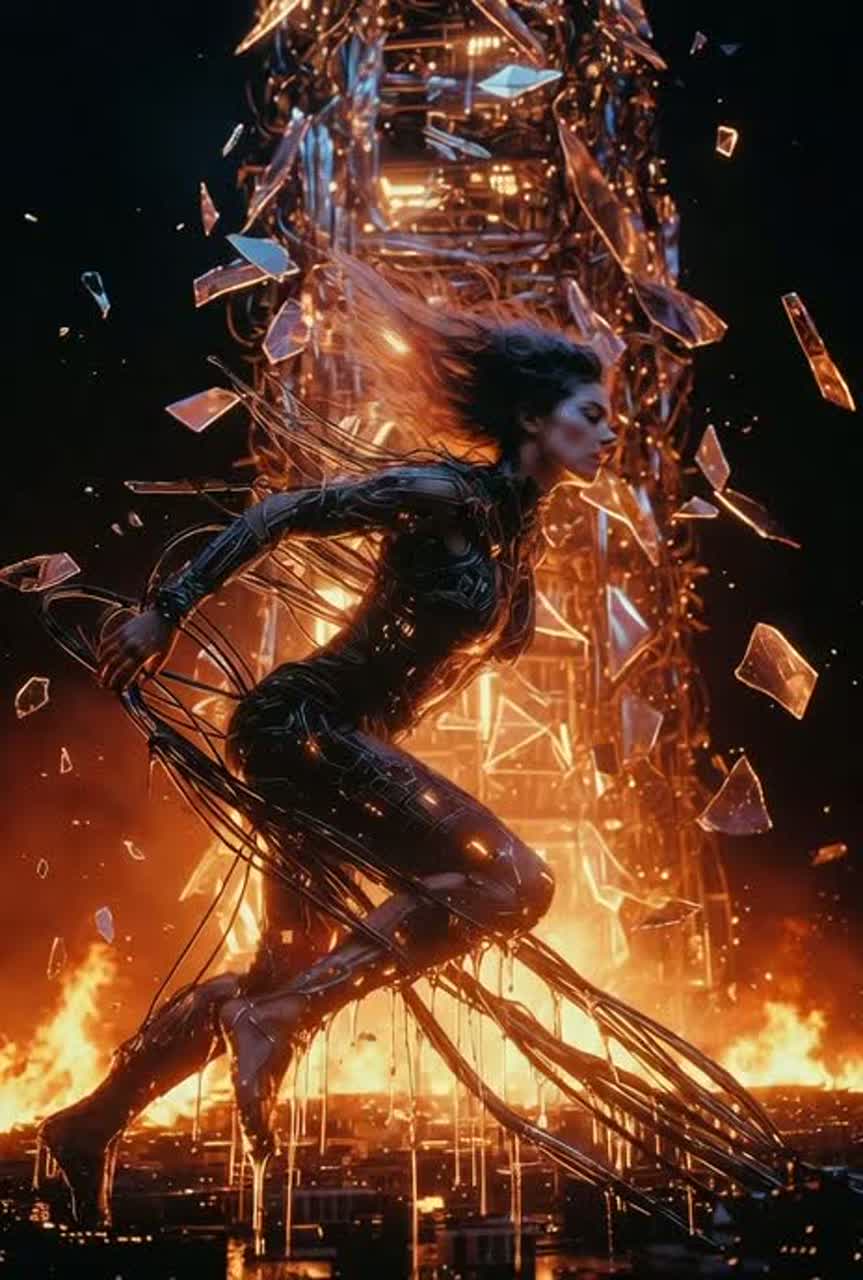 Scorching high-octane cyber-fusion techno at 145 BPM—punishing, hammering four-on-the-floor kick like molten heartbeats, searing supersaw leads screaming upward, dripping liquid bass wobbles that melt and slide, crackling overload FX and roaring circuit destruction; fierce, gasping female vocoder lead drenched in heat distortion, layered with ecstatic roars and molten crackles; atmosphere of crown relay tower in meltdown—glass vibrating, chrome warping, silver rivers pooling, the entire city feeling the wave; focus on the raw, passionate experience of power fusing with flesh—the brutal heat, the shuddering release, the deliberate press of body against fire, intensely erotic yet restrained, body-moving, chart-destroying heat