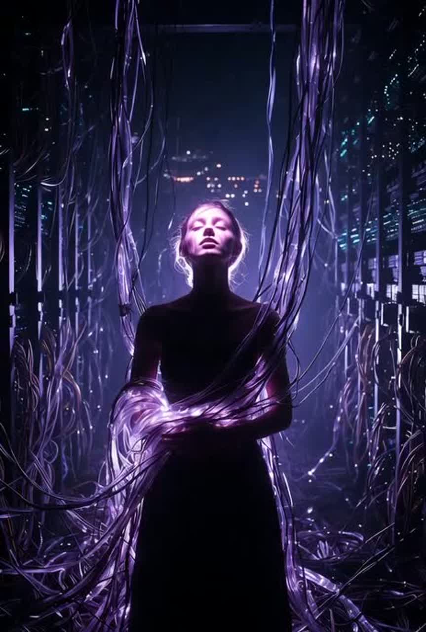 A track grounded by deep, rolling sub-bass at 122 BPM, layered with crystalline, futuristic synth arps pulsing with glitchy micro-rhythms, Breathy, intimate vocoder female leads float above ethereal pads, Wet reverb, distant metallic hums, and digital artifacts evoke a cyberpunk server-farm, Tension rises via restrained euphoric swells—carefully controlled, intense, and hauntingly vulnerable