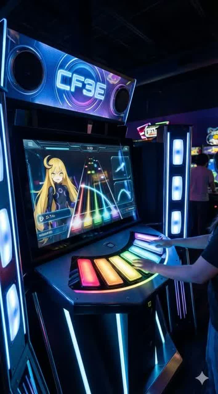 High-energy rhythm for rhythm games, Extremely fast BPM (170–185), Punchy kicks, sharp claps, aggressive snare rush, chaotic tom fills, Jersey-club bounce (bed squeak / triplet kicks) blended with rave synth stabs, Cute but insane melody line with chiptune accents and anime-style vocal chops (“ha!” “hapi!” “neiro!”), Hyper-bright synth leads, over-the-top risers, laser SFX, arcade UI beeps, Breakdown (発狂地帯)