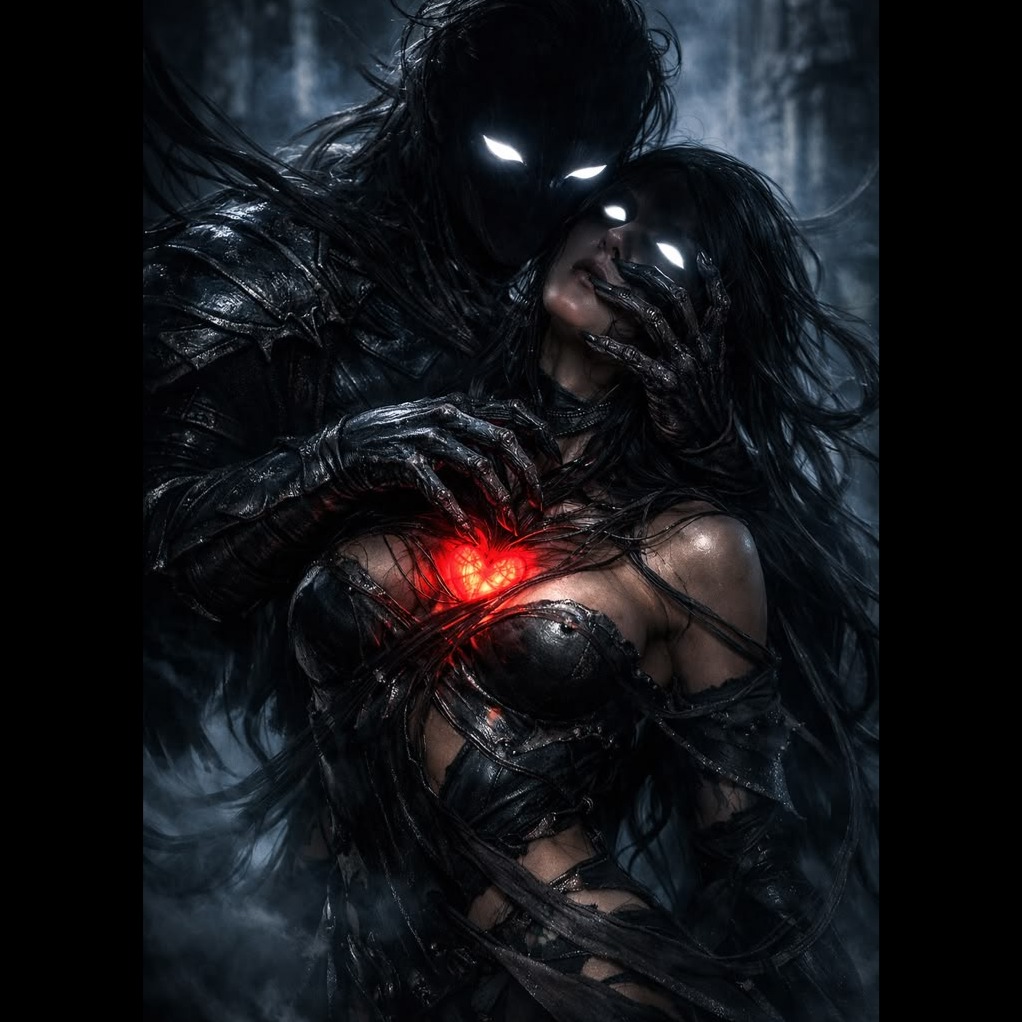 Hybrid dark dubstep and industrial at lento violento tempo, deep heavy bass swells and grinding synths, Female vocals emotional and haunting up front; male vocals demonic, distorted, and whispering in call-and-response, Eerie choir pads and choral stabs hang in the distance, with glitchy reverses, echo trails, and sudden dropouts, Tension builds through layered drones, whispered textures, and dramatic bass drops, cinematic horror atmosphere, unsettling and immersive, dramatic, reggae, vocal, emotional, dubstep, deep, tone, industrial, glitch