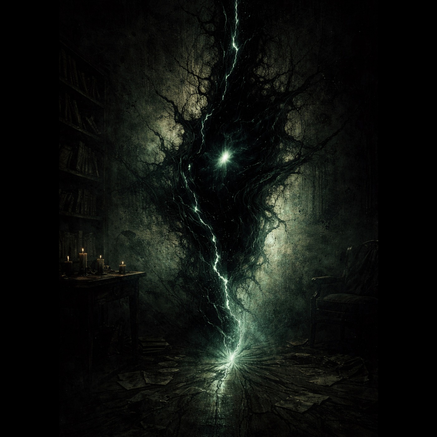 Gnostic Symphonic Blackened Metal, Cyber-Gothic, Dark mystical male voice, haunting female choir, Dark Industrial Ambient, Glitchy Sci-Fi Horror, Distorted Heavy Bass, Cold Mechanical Percussion, Eerie Whispered Vocals, Cinematic Soundscape, Shifting Reality atmosphere, Haunting Synth Pads, Deep Male Vocals, Psychological Thriller vibe, 85 BPM, Distant Echoes