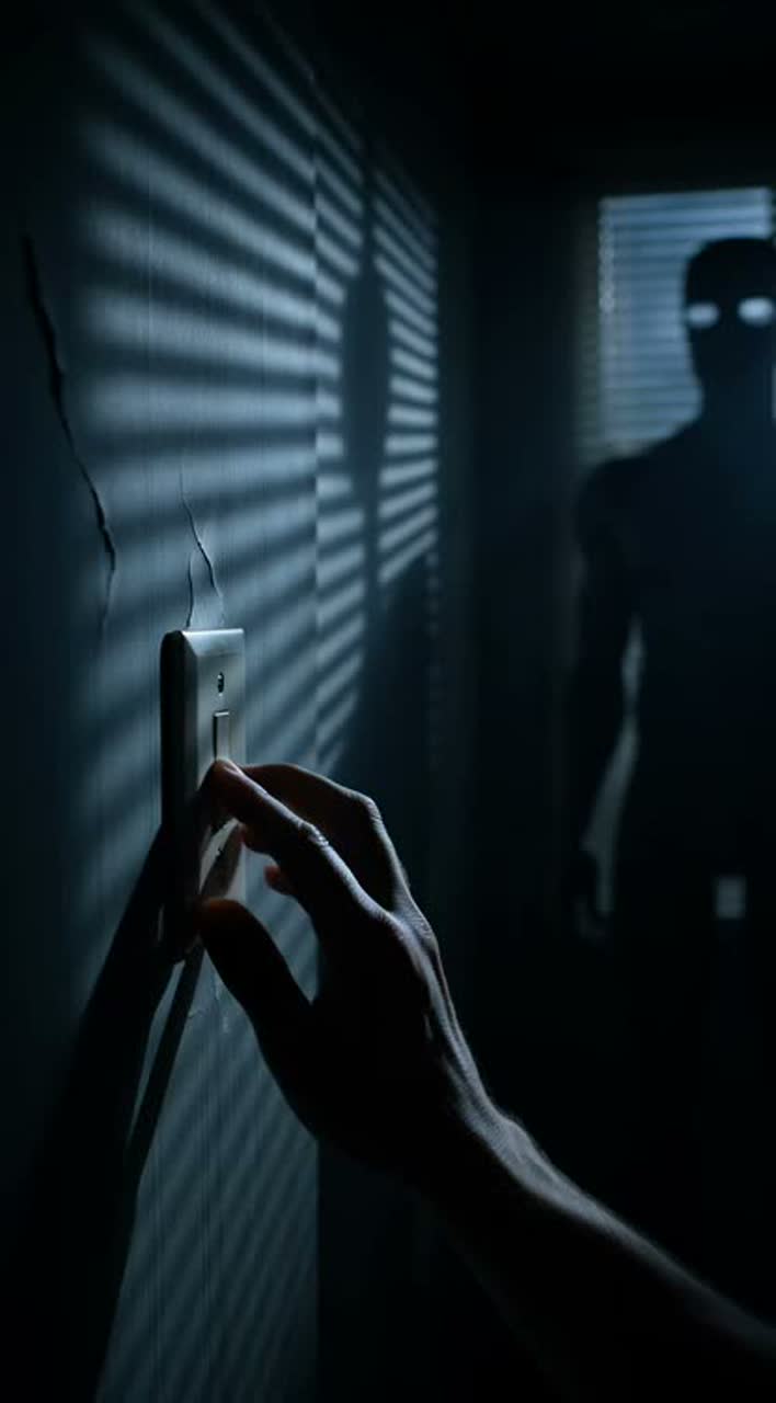 Dark Cinematic Ambient & Heavy Post-Industrial Horror, 65 BPM, SOLE MALE VOCAL ONLY, Voice: Deep, gravelly baritone—shifting from a terrified, gritty whisper in verses to a powerful, raw guttural roar during the "Precz Szatanie" exorcism, Instrumentation: Cold, minimalist piano notes, a massive pulsating sub-bass drone that feels like physical chest pressure, and distorted electric guitar walls, Sound Design: Hyper-realistic rhythmic clicking of a light switch ("click-clack"), sudden electrical hums, sparks, and eerie background whispers with heavy reverb, Digital artifacts, signal tearing, and a faint, terrifying chuckle in the distance, Intro: Frantic clicking and heavy breathing in a dead-silent room, Production: Extreme 3D spatial depth, binaural audio capturing a "presence" directly behind the listener, Mood: Pure dread, claustrophobic, and malevolent, Outro: Fading into broken audio fragments, white noise static, and a final mechanical click, High-fidelity 8K audio, [End]