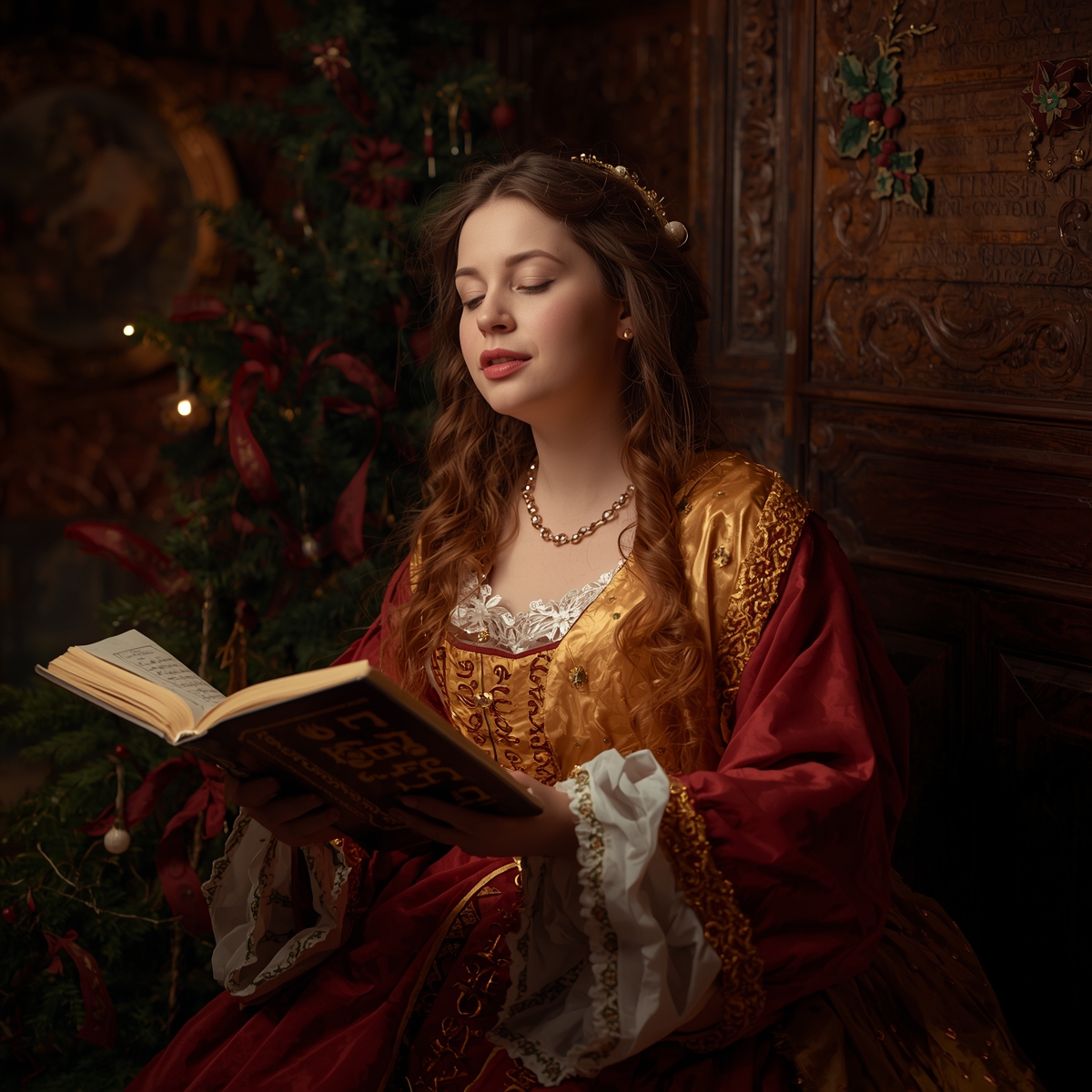 Create a sensual and elegant Christmas song inspired by 17th-century European courts, The mood is ethereal, slow, and luminous, with a baroque atmosphere and poetic wordplay, Vocals should sound warm, intimate, and slightly theatrical, as if sung in a candlelit hall with vaulted ceilings and golden decorations, The instrumental style should blend soft strings, harps, delicate bells, and gentle choral textures, creating a magical, noble, winter-night ambience, The song should feel refined, mysterious, and subtly seductive, evoking swirling snow outside tall windows, glowing candles, shimmering garlands, and a sense of aristocratic celebration, Keep the tone elegant, atmospheric, and emotionally immersive