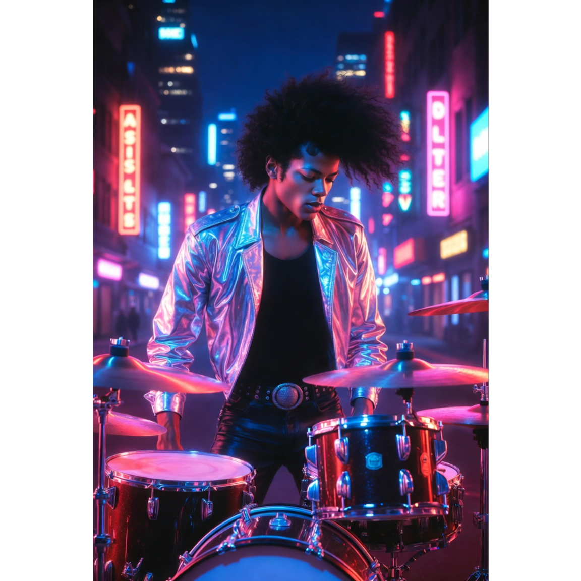 Create an original funky pop / pop-funk fusion song with a strong retro 80s vibe and subtle punk attitude, The main vocal style should emulate Michael Jackson’s energetic 80s delivery (85%): breathy accents, rhythmic syncopation, expressive slides, sharp consonants, playful confidence, Add light Bruno Mars–style ad-libs (15% total) during chorus repetitions and bridge (“oh-oh”, “yeah!”, “come on”), The instrumental arrangement should feature tight disco-funk drums, punchy slap bass, bright retro synths, and edgy punk-influenced guitar stabs, The mood: energetic, stylish, seductive, electric city-night energy, Lyrics should tell a story of a mysterious figure entering a neon city night, where punk attitude collides with funky rhythm, Use vivid urban imagery, dynamic movement, and tension that builds into a dance-driven chorus, No references to existing copyrighted lyrics or characters, The song must be entirely original