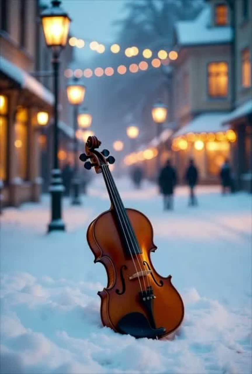 Style / Mood: Emotional Christmas ballad, cinematic, Vocal: Deep male voice, whispered, almost spoken, intimate and emotional tone, Instruments: Solo violin (dominant), soft atmospheric pads, deep wet bass, slow dark R&B/trap beat (60–65 BPM), subtle winter sound design (bells, sleigh bells, wind, soft chimes, distant church bells), Atmosphere: Cold, emotional, cinematic — snow ambience, breath sounds, pauses, soft sighs, Structure: Intro with solo violin → slow verse (spoken tone) → emotional chorus with subtle Christmas bells and violin swells → bridge with breathing and minimal beat → ending fades with a long violin note and winter wind, Keywords: emotional, Christmas night, snowy ambience, love, longing, cinematic, heartfelt, slow rhythm, reverb space, deep mood, ethereal, intimate male voice
