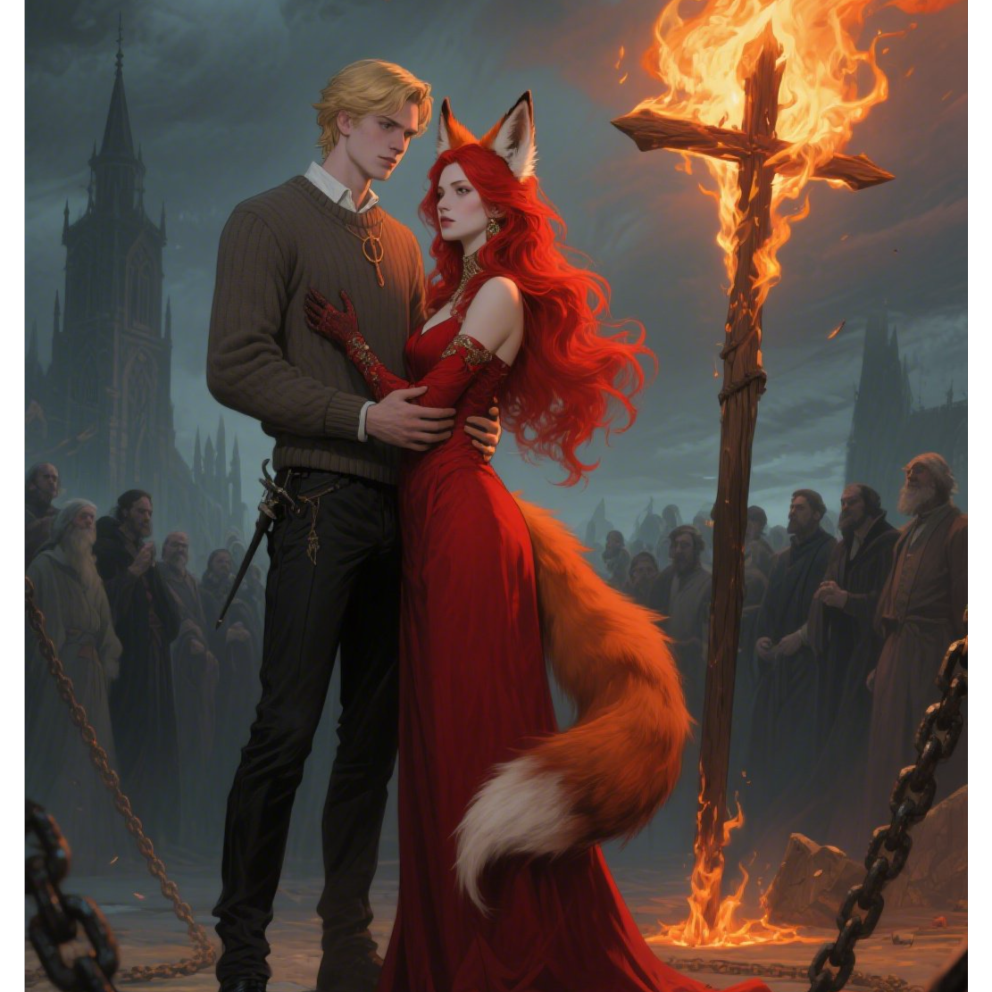 Epic gothic melodic ballad and soft rock fusion with emotional strong vocals, based on a tragic tale of a fox condemned as a witch and an inquisitor who saves her, Melancholic verses sung in a haunting style, evolving into uplifting orchestral moments, Instruments: pipe organ, violins, ambient synths, electric guitars, choir pads, Start at 70 BPM, slowly build to 82-90 BPM, Mood: poetic, cinematic, dark-to-light transformation, Focus on vocal clarity, dynamic emotion, and atmospheric depth, Singer Vocals: deep strong female mezzo-soprano voice