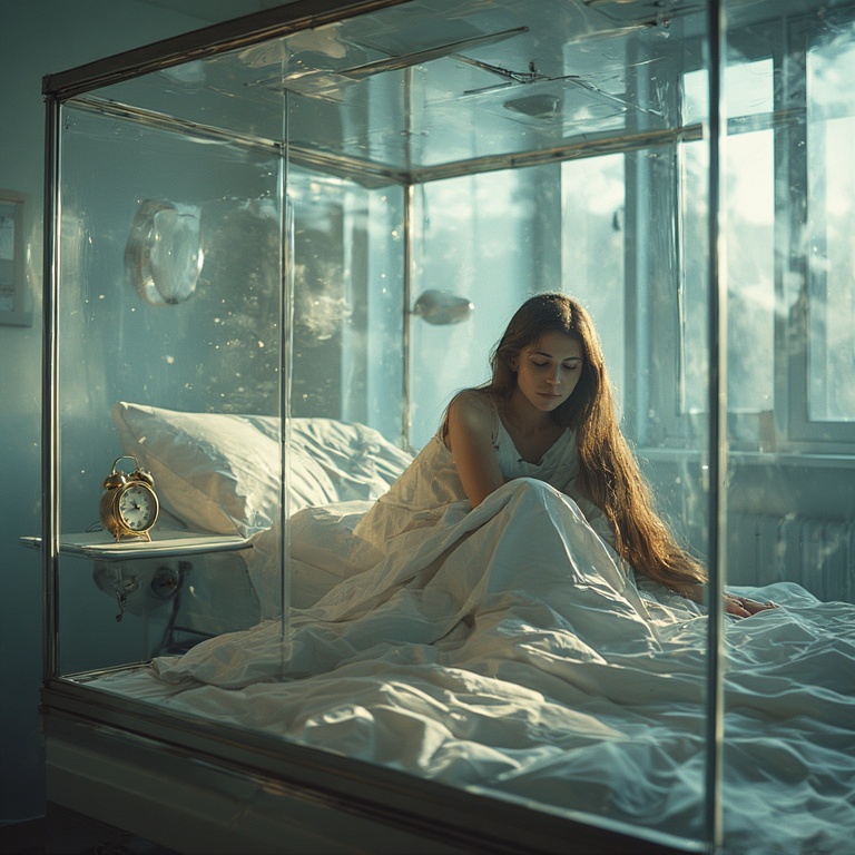 Experimental alt-pop with dreamy ambient textures, soft and intimate female vocals with slight breathiness, glitchy electronic accents, warm analog synth pads, gentle arpeggiated melodies, subtle vinyl crackle, minimal percussion, tempo around 60-70 BPM, introspective and sleepy mood, surreal sound design reflecting distorted perception of time, soft reverb and delay on vocals, slow builds and fading transitions