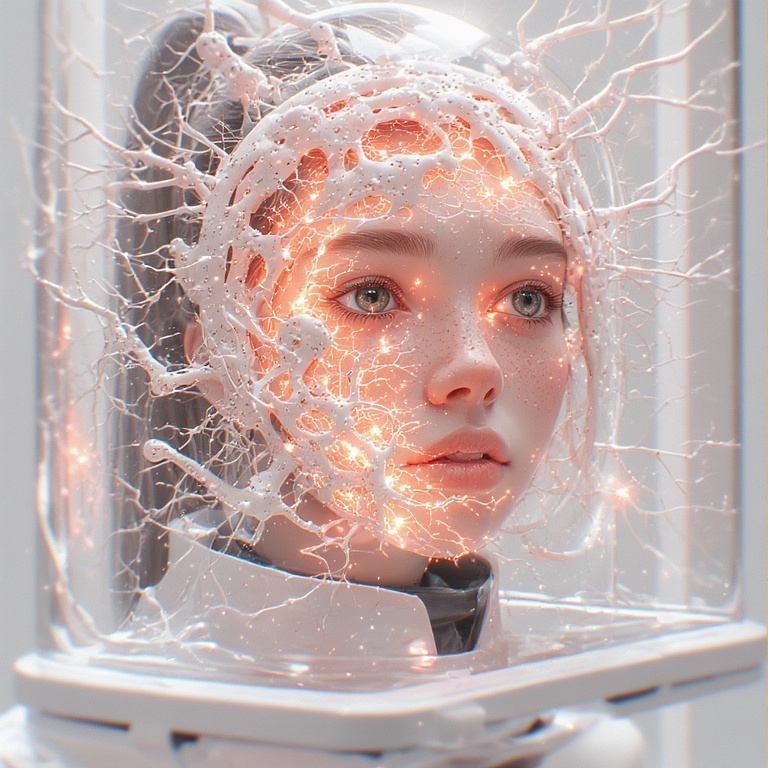 Experimental, dreamlike, minimalist electronica with whispered emotional vocals, subtle digital glitches, swelling synth pads, and a pulsing yet fragile beat, Haunting and futuristic mood