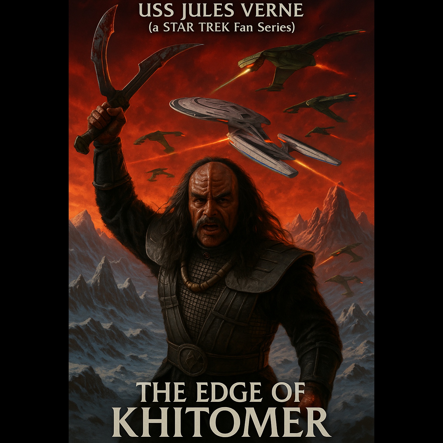 Epic cinematic orchestral soundtrack in the style of high-stakes Star Trek TNG style battle or crisis scenes, Driven by rhythmic low strings and syncopated brass pulses (French horns, trombones, trumpets), underpinned by taiko drums, snare rolls, timpani, and hybrid electronic percussion, Fast-paced staccato strings and darting woodwinds create tactical urgency, Tense, dissonant choir textures (wordless), ambient synth pulses (dark, granular), metallic FX and processed atmospheres add futuristic suspense, Dramatic dynamic shifts: suspenseful low-register sections with tremolo, ticking elements, and ambient textures; explosive tutti sections with bold brass, thunderous percussion, and choir climaxes, Ideal for space battles, countdowns, sabotage or command decisions under pressure, Instrumentation includes: full string ensemble (with solo cello and viola), aggressive brass (horns, trombones, tuba), sharp woodwinds (piccolo, bass clarinet, English horn), taiko drums, snare, timpani