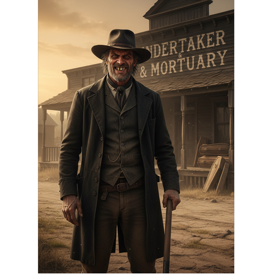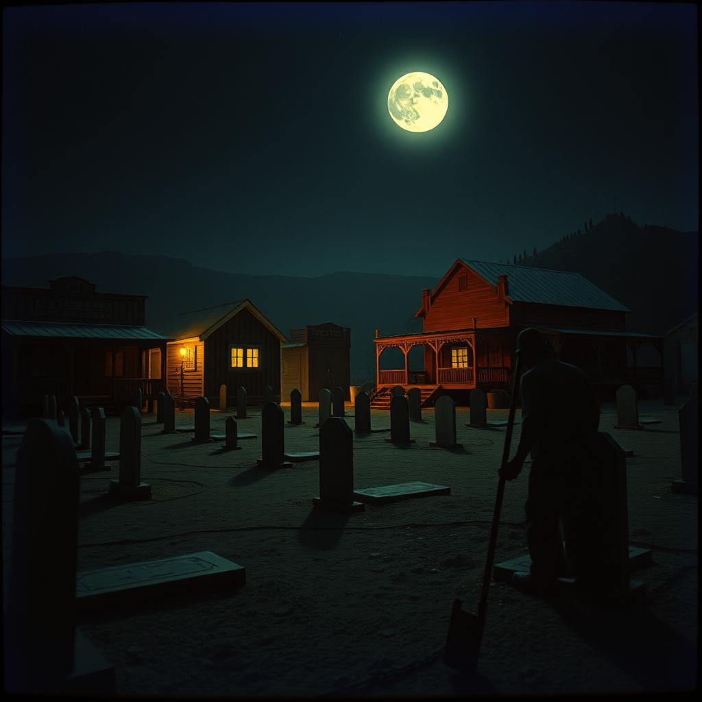 Dark folk western ballad, 78 BPM → 92 BPM in choruses, Gritty, half-spoken male vocal, Lyrics in English: poetic, haunting, about a one-eyed, lame gravedigger in a cursed Wild West town who digs not for bones, but for truth buried in lies, Instrumentation: detuned acoustic guitar, jaw harp, swampy drums, slide guitar, raw harmonica, tribal percussion, subtle industrial textures (metal clangs, sub-bass drone), No strings, no choirs, no pop melodies, Structure: intro → verse → chorus → verse → chorus → whispered bridge → final chorus → wind outro, Mood: desolate, morally heavy, sun-scorched dread, Production: lo-fi, dry, with ASMR-level breath and gravel in vocal, Feels like a ghost telling secrets to the dirt, Tag: #Dead Men's Bend