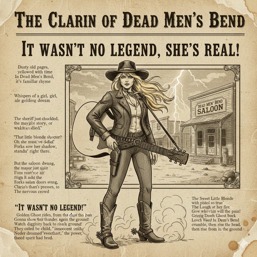 Dark Western outlaw country with Southern Gothic atmosphere, mid-tempo, cinematic and dusty, Haunting female lead vocal with subtle Southern drawl, singing in first person as the town of “Dead Men’s Bend” itself, remembering blood, gunfights and the golden-haired ghost who’s come back for revenge, Verses tell a detailed story, choruses repeat a strong hook like “I’m Dead Men’s Bend, I don’t forgive, I don’t forget”, Gritty electric and slide guitars, twangy six-string, mournful fiddle, deep bass, brushed drums, distant church bell and barroom piano, ghostly backing harmonies, Big, dramatic final chorus and long reverb tail