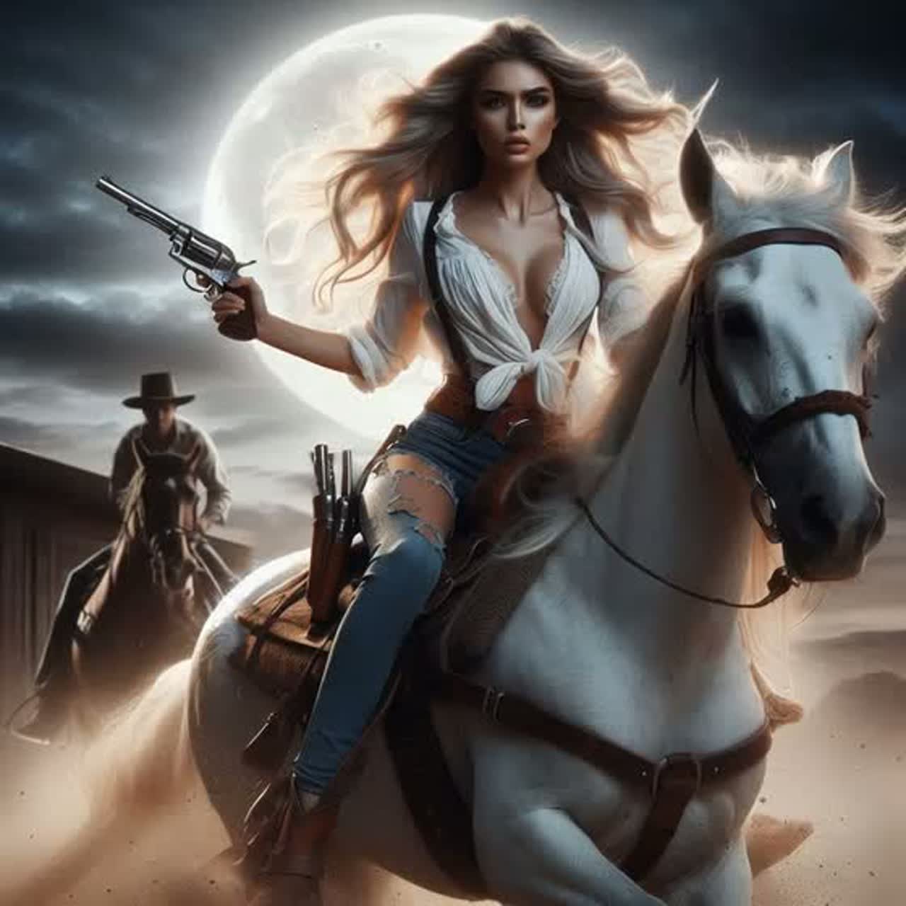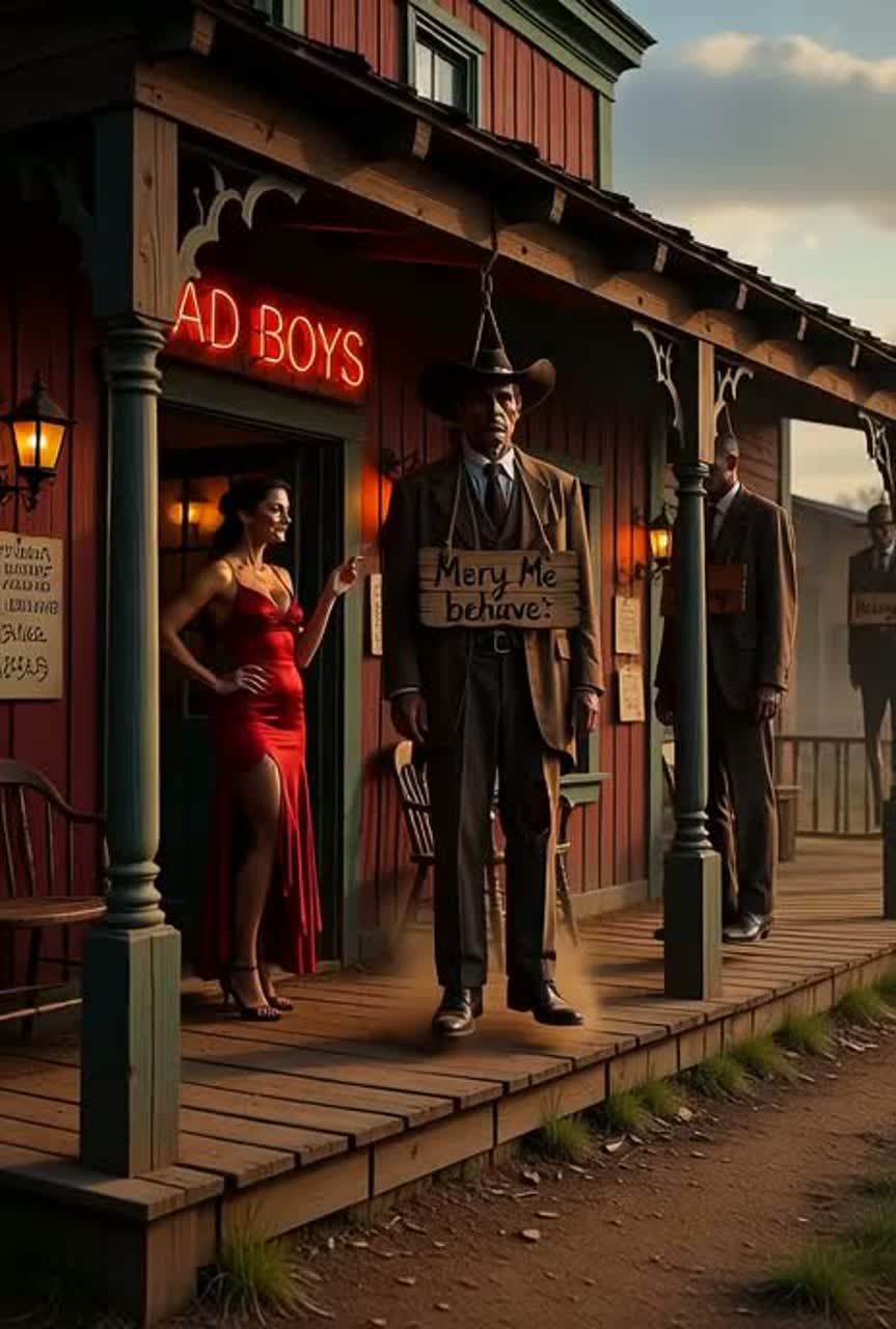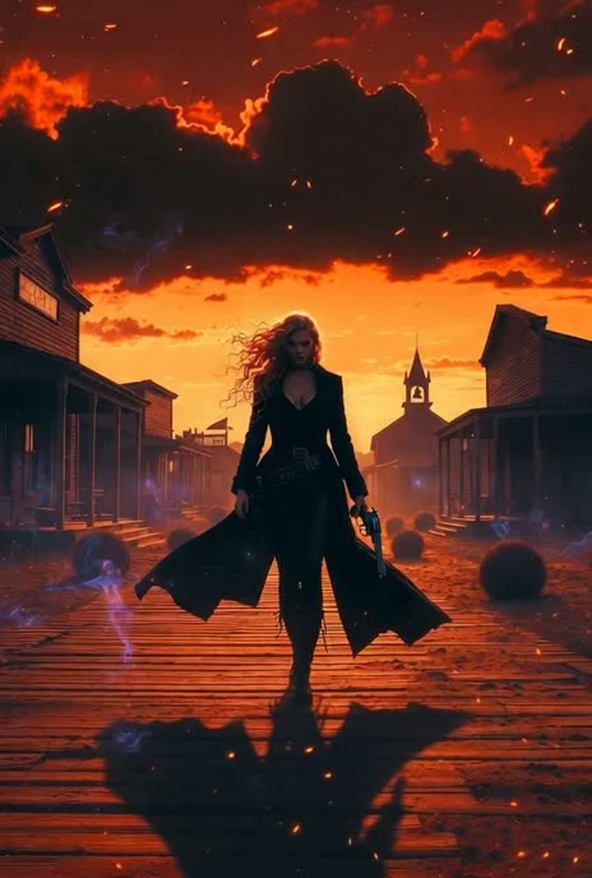 Dark Western outlaw country with Southern Gothic atmosphere, Fierce, powerful female vocals with subtle Southern drawl and dangerous edge, Ominous banjo, deep bass, dark atmospheric pads, menacing slow beat around 85 BPM, Think Joohnny Cash's darkness meets Llana Del Rey's cinematic drama with outlaw femme fatale attitude, Gritty slide guitar, haunting harmonies, desert wind ambience, Sparse verses building to explosive choruses, Raw, authentic Western instrumentation with modern dark production, Voice like honey laced with venom - sweet but deadly, Dusty, smoky, dangerous saloon atmosphere with ghost town reverb