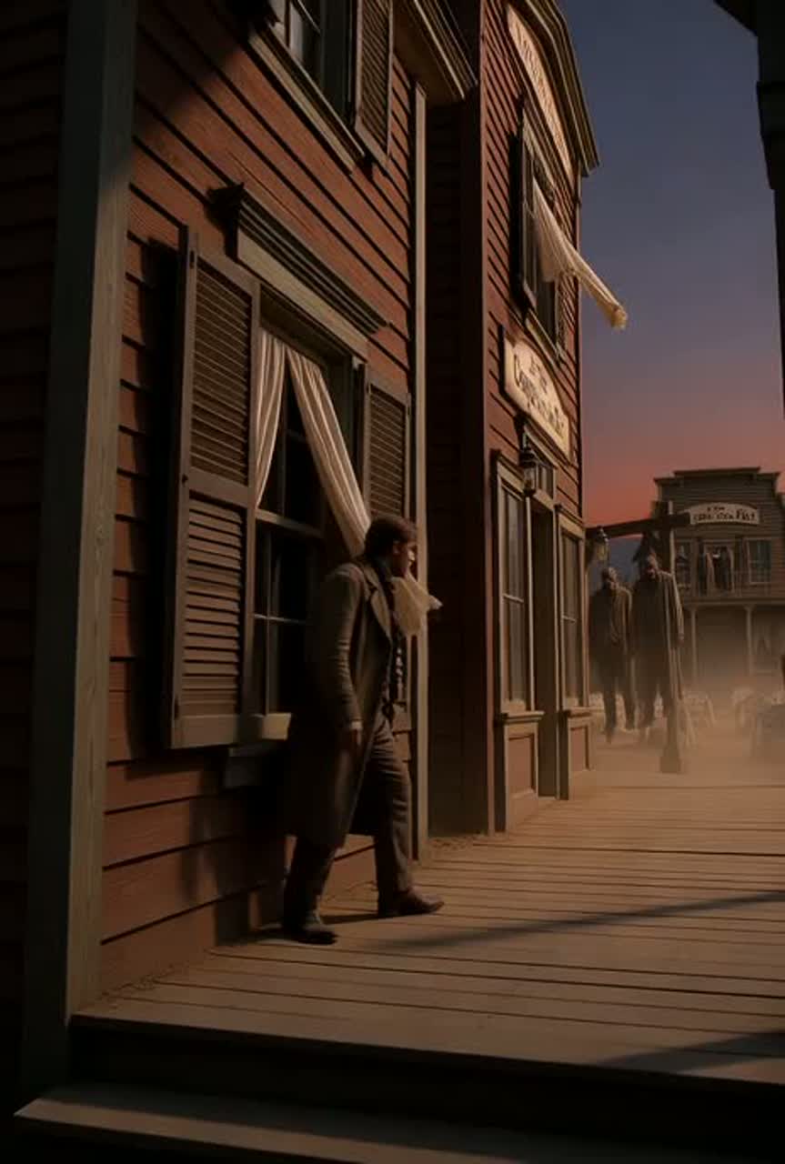 Western-dark ballad with cinematic tension, deep male voice (tenor–spinto), dusty desert atmosphere, acoustic guitar with slow tremolo, bowed cello for tension, brushed drums, distant whistling like-Ennio Morricone-like subtle industrial grit under the mix, Start immediately with lead vocal line — no intro, no ambient buildup, Texture: gritty, velvet-dust, low warm reverb, wind-through-bones tone, Dynamic perspective: the town watching him walk, the inner monologue of the bard, the desert echo, Clip Volume: +3, ‑Female Vocals Chorus Vocals Wordless Vocals Intro Vocals Vocalizations