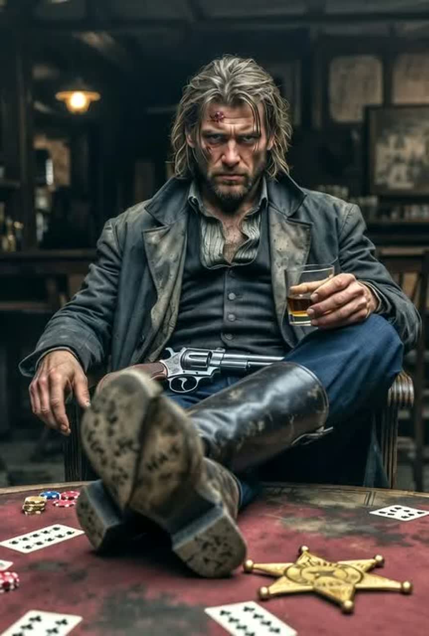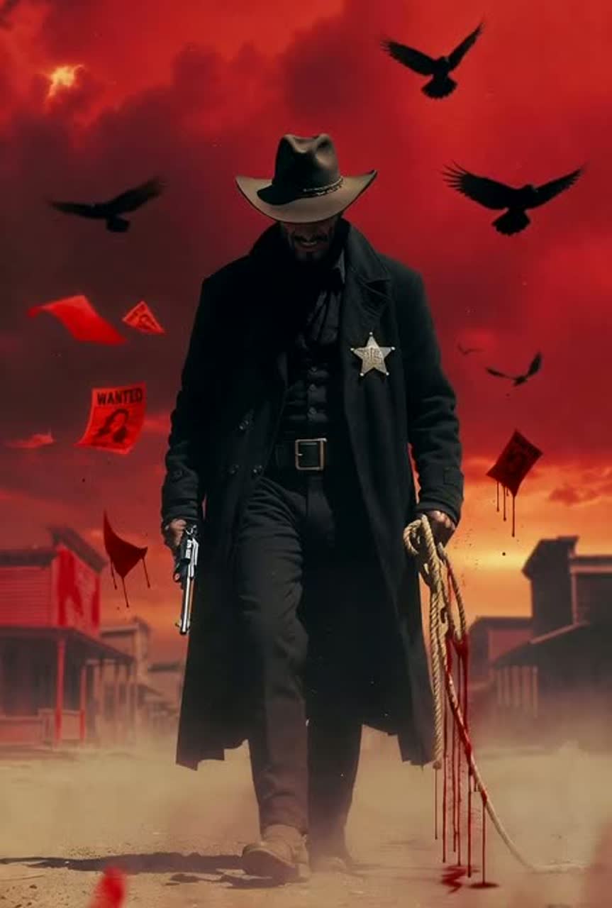 A powerful, dark, and gritty Outlaw Country Rock track with Southern Rock influences, in the style of Johnny Cash's meets Lynyrd Skynyrd's or modern bands like Whiskey Myers's, The song is driven by a heavy, distorted, chugging electric guitar riff, a thunderous bassline, and pounding, heavy drums, A dirty slide guitar adds a menacing, swampy texture, The male vocal is a deep, confident, and menacing baritone, delivering a narrative from the perspective of a ruthless gang boss ruling a wild west town
