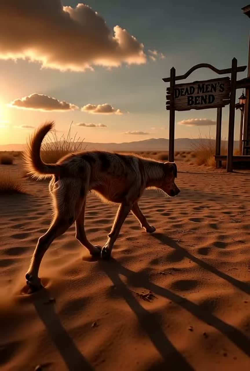 A slow, emotional Western ballad told from the viewpoint of a starving stray dog arriving at a desert ghost-town, Sound is dry, dusty, and intimate: fingerpicked acoustic guitar with string squeaks, soft wind ambience, sparse banjo plucks, broken harmonica cries and a mournful fiddle, Vocals are low, gravelly, half-spoken, like an exhausted animal thinking out loud, Drums use only soft brushes for a heartbeat-like pulse, Atmosphere feels lonely, cinematic, and fragile — the dog collapsing at the edge of town, wondering if Dead Men’s Bend will save him or bury him