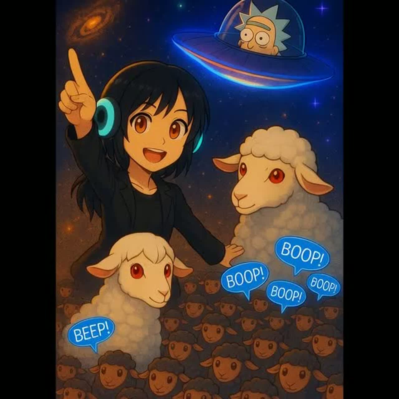 An EDM track driven by thumping four-on-the-floor kicks, staccato synth bleats that mimic sheep sounds, and playful glitch effects, The hook uses processed “beep” vocal chops and bouncy melodic layers, while the drop adds funky basslines, crowd chants, and punchy side-chained pads for epic dance energy