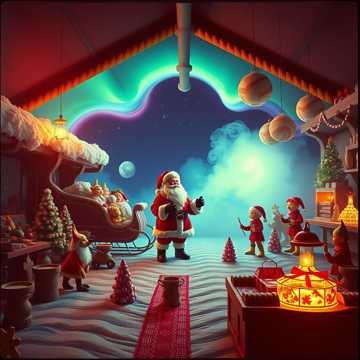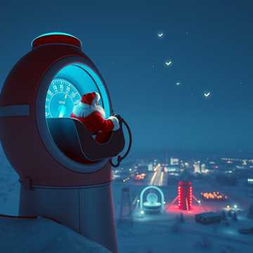 Tron-inspired Christmas synthwave at 128 BPM, heavy electronic production with massive drops, processed vocoded vocals, digital aesthetic with neon imagery, celebrates Santa as program crossing from Grid to reality, circuit board sleigh bells, glitchy Christmas FX, four-on-floor kick with epic synth leads, North Pole as digital realm, presents as data packets, portal opening on Christmas Eve, materialization sequence, cinematic electronic production, blue and red neon lights, rezzing sleigh concept, digital frontier meets holiday magic, end of line aesthetic