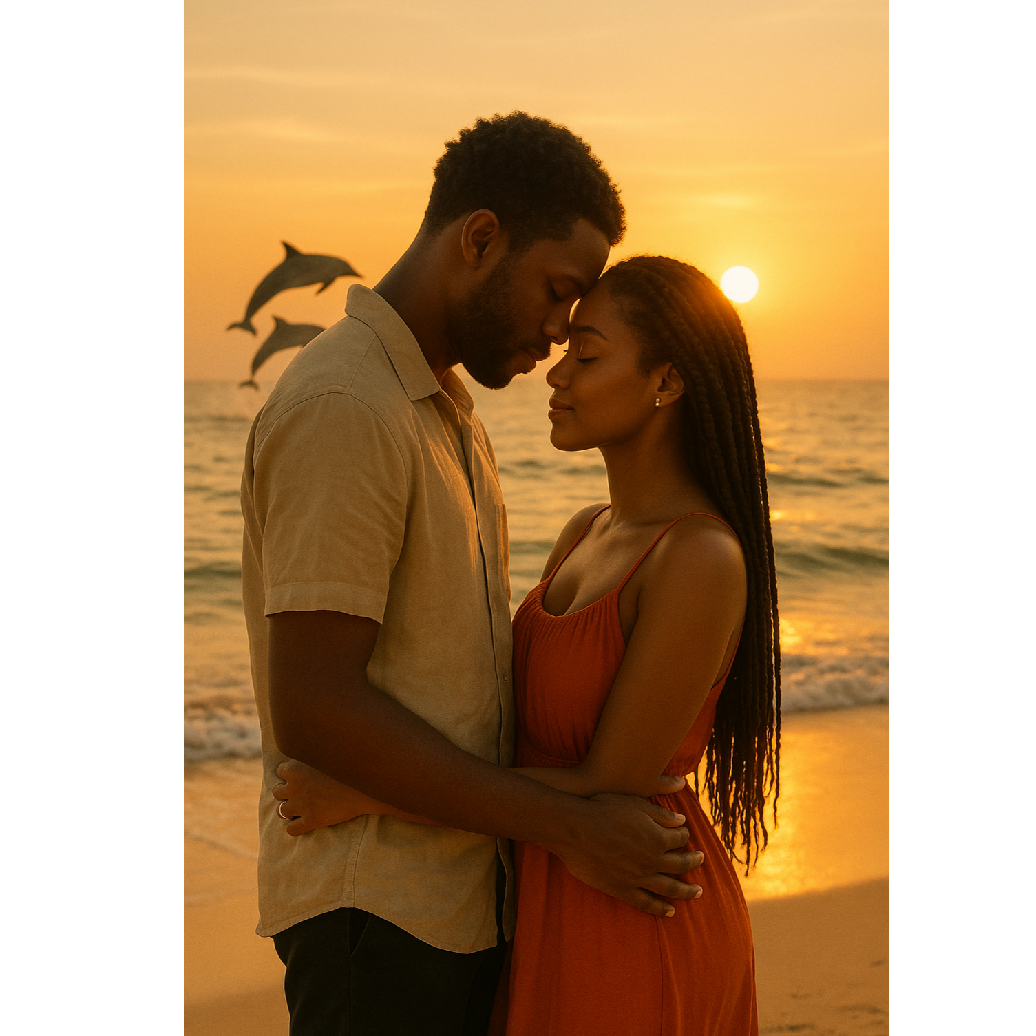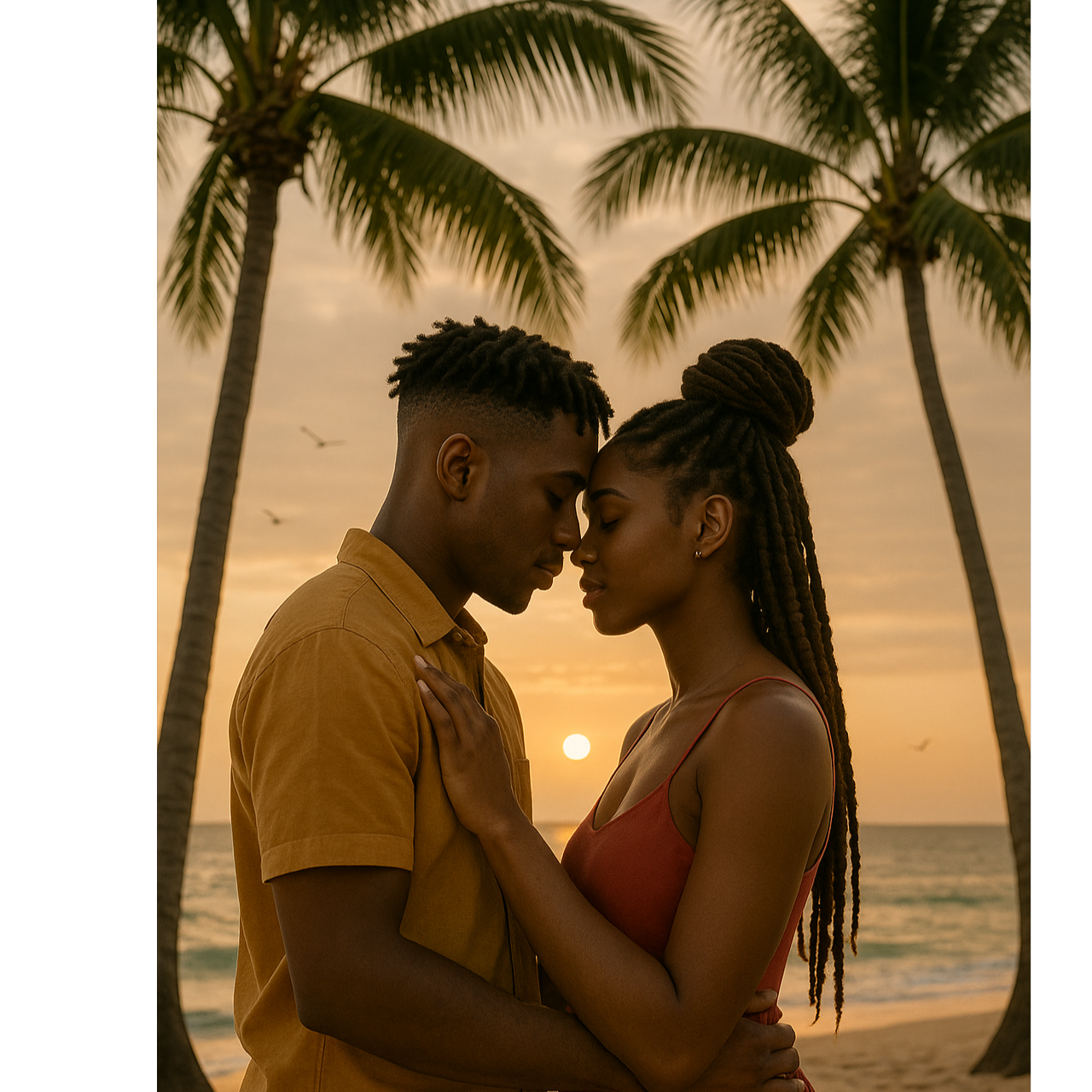 Instruments: Afrobeat percussion, deep rounded bass, soft electric piano chords, gentle plucks, airy pads, sweet vocal harmonies, muted guitar licks, subtle shakers, tropical FX (waves, birds) in intro/outro