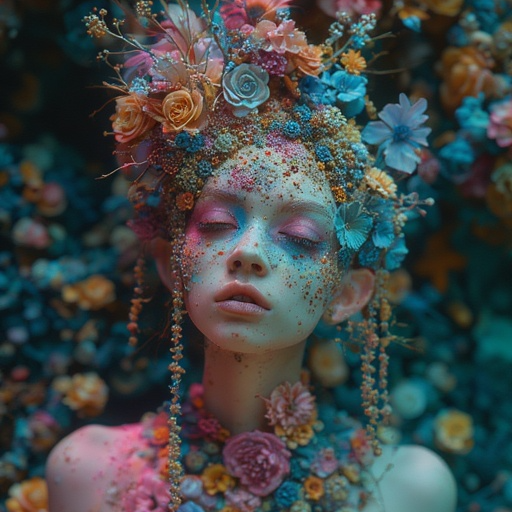 Long suite song, Melody is dynamically oblique and twistedly angular, rhythm is muddy and relentless with vicious crooked structure, Bubblegum Girl has ethereal sexy voice and she sings funny demented like a chained angel during a lustful black mass party, Guitars are aggressive, deconstructed and bluesy decadent, with dissonant and syncopated riffs, 432 Hz distorted ultra bass gallops with intense saturation and biting modulation, Jazz virtuoso drum with deep tom-heavy grooves and heavy offbeat hi-hat accents creates raw drive and tight skittering patterns, Classical piano shifts from ritualistic tragic cadences to obsessive ostinati, Transcendental Eurodance synths arpeggios and dancefloor leads run along the EBM pulsing rhythm, Dark new-wave breakbeats and gothic synth pads shifts from relentless rave delirium to cathedral nightclub ecstasy