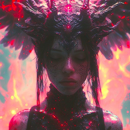 Long suite song rooted in pagan and esoteric traditions, fused with Djent Metal Vibe and Classical Piano Ritual, Archaic melody is dynamically oblique and twistedly angular, Rhythm is muddy, vicious and crooked structured, Female heavy metal singer has cristal sexy voice and she is going demented like a chained angel during a lustful black mass, Layered female choral voices form slow, overlapping chants using modal melodies, drones and sustained tones, Vocals create subtly psychedelic atmosphere, Breathy and resonant textures gently support the voices, evoking hidden rites and timeless otherworldly presence, Guitars are aggressive, deconstructed and bluesy decadent, with dissonant and syncopated riffs, 432 Hz distorted ultra bass is running behind with intense saturation and biting modulation, Jazz virtuoso drum with deep tom-heavy grooves and heavy offbeat hi-hat accents creates raw drive and tight skittering patterns