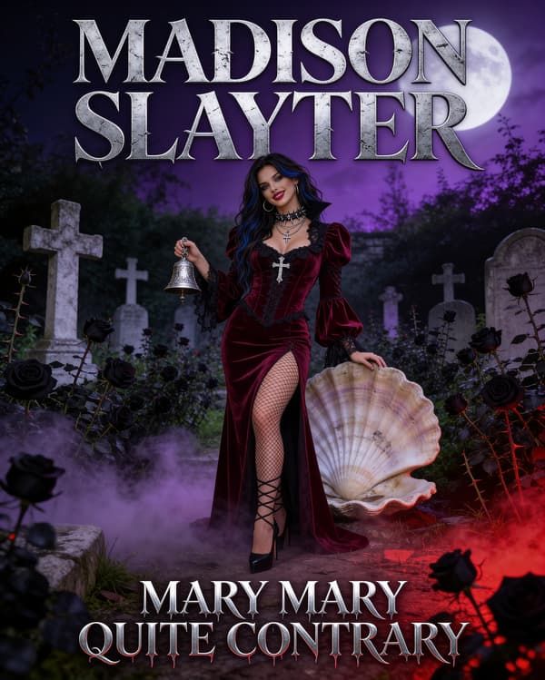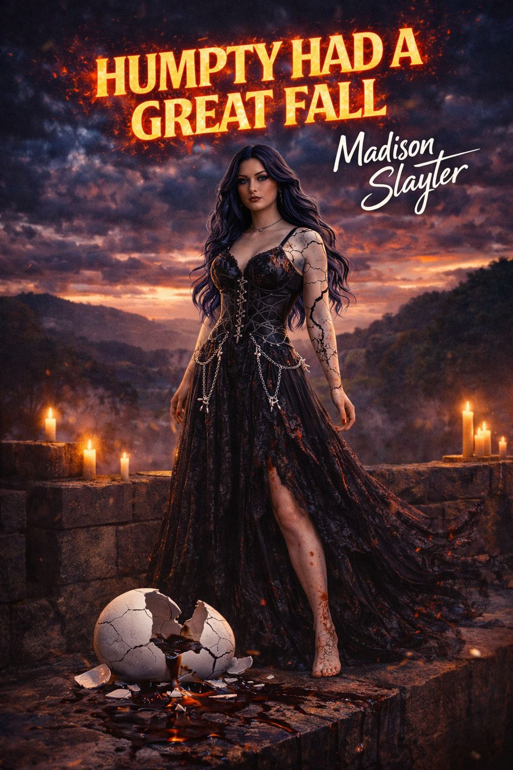 dark gothic symphonic rock, crushing orchestral guitars, tolling bells, sweeping strings, pounding cinematic drums, atmospheric synth layers, powerful female lead vocals, bright brassy coloratura soprano, extreme vocal agility with fast runs trills leaps, powerful belts, smooth falsetto flips, slight vocal fry, nasal-forward resonance, high-drama emotional delivery, crystal clear diction, seductive sassy attitude