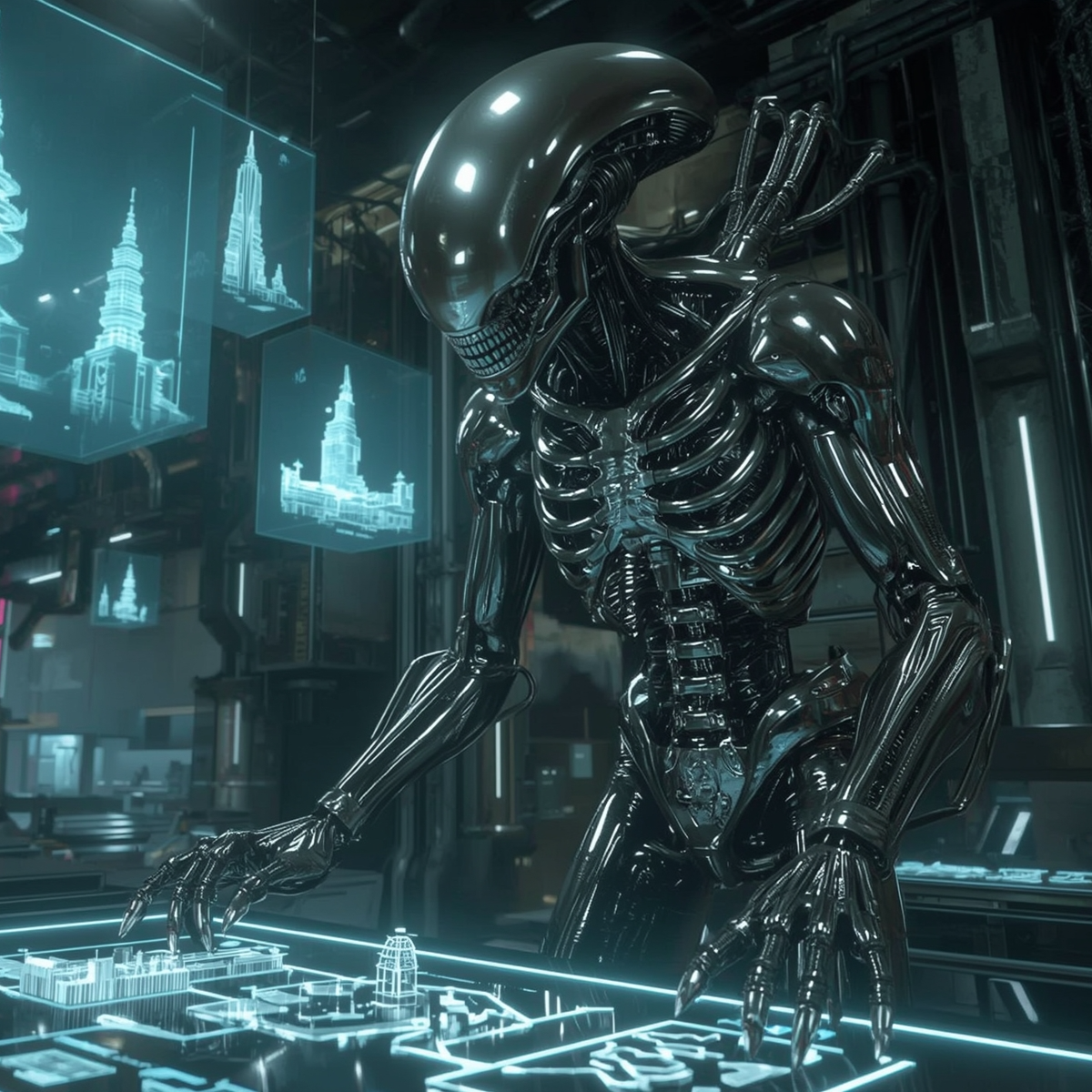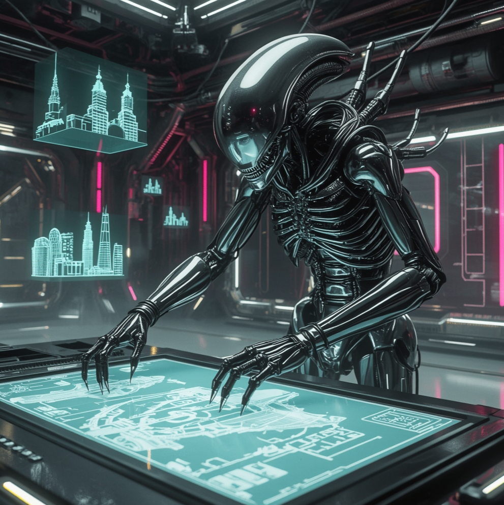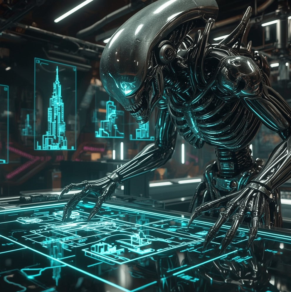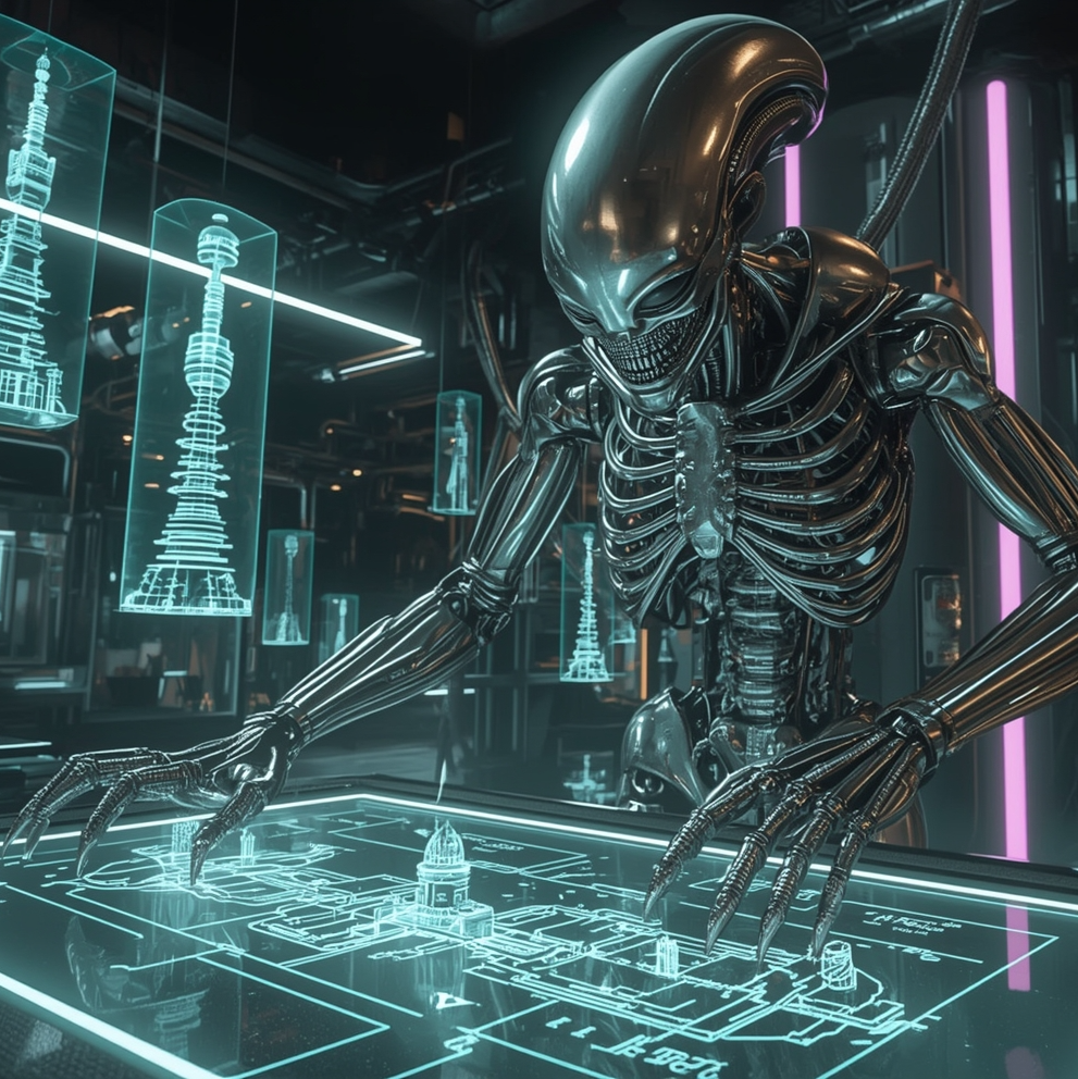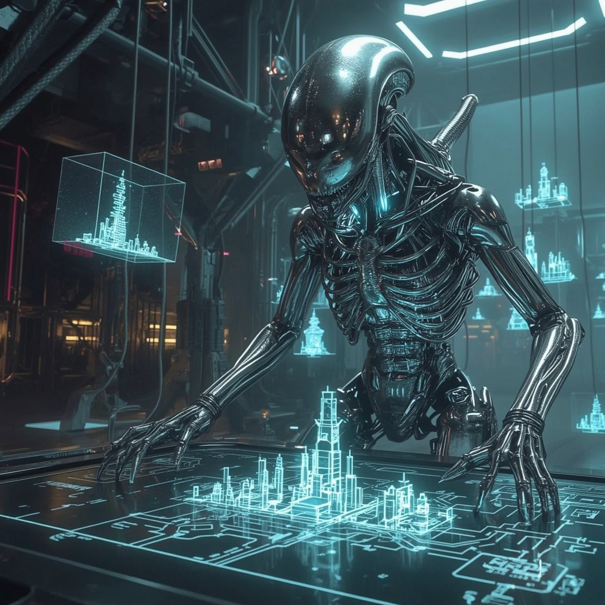 A glimpse into Humanoid Alien - where human, machine, and xenomorph fuse into titanium architect builders, ideal for working.