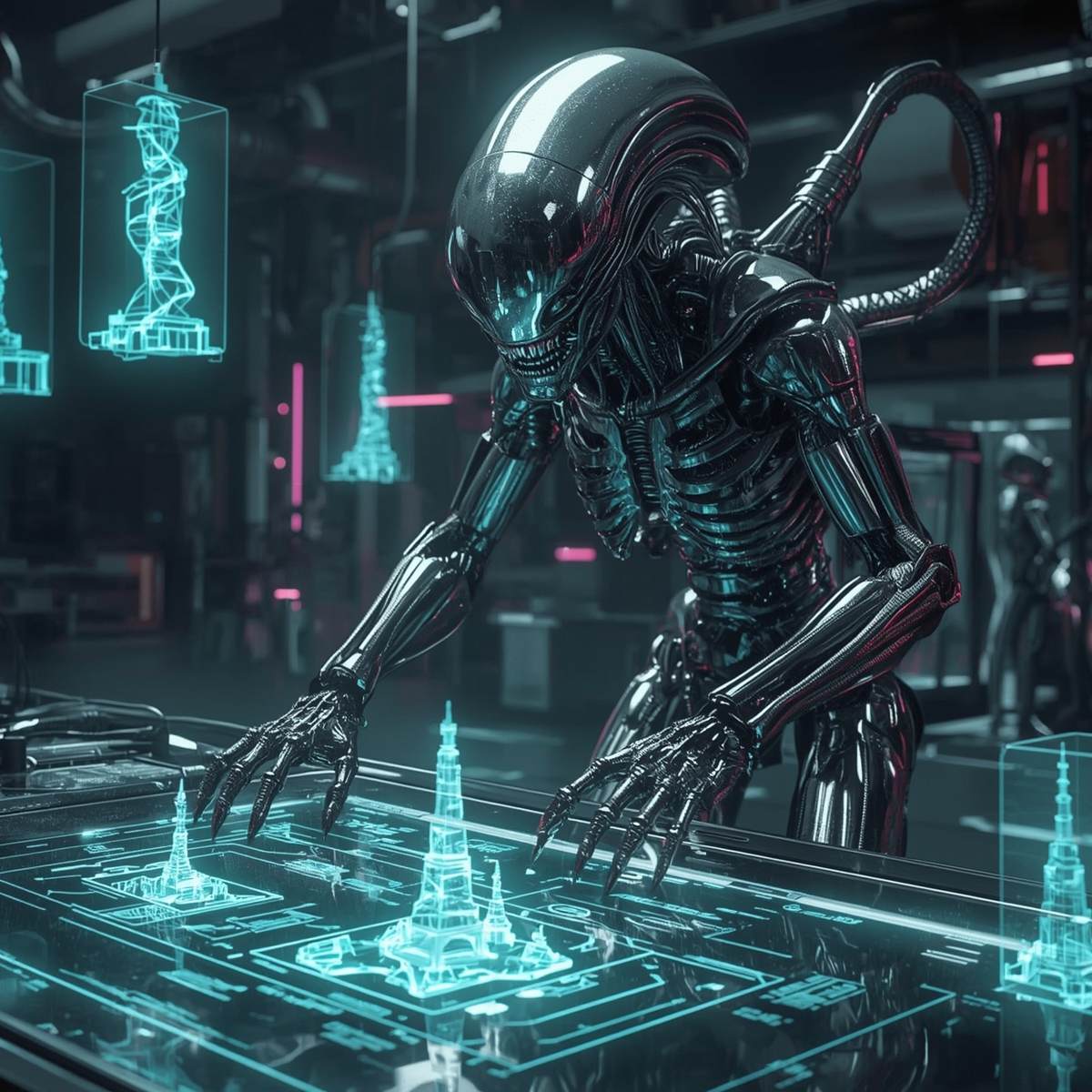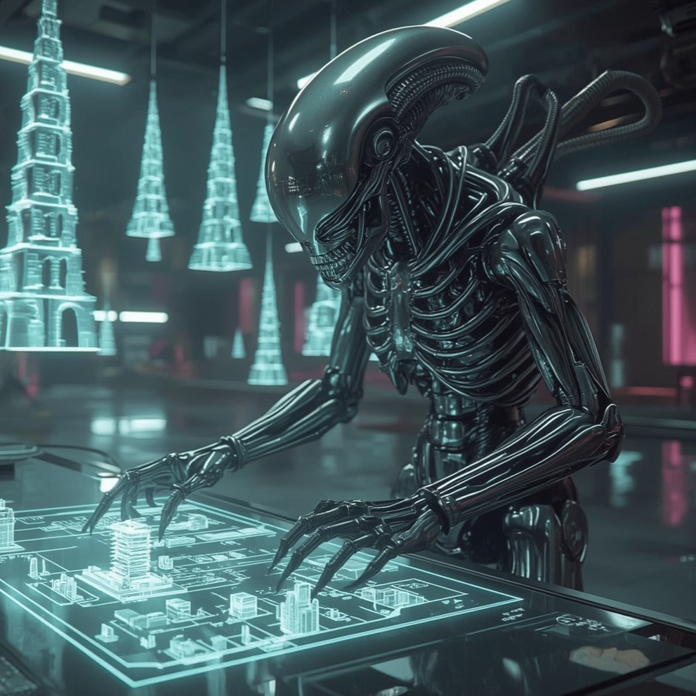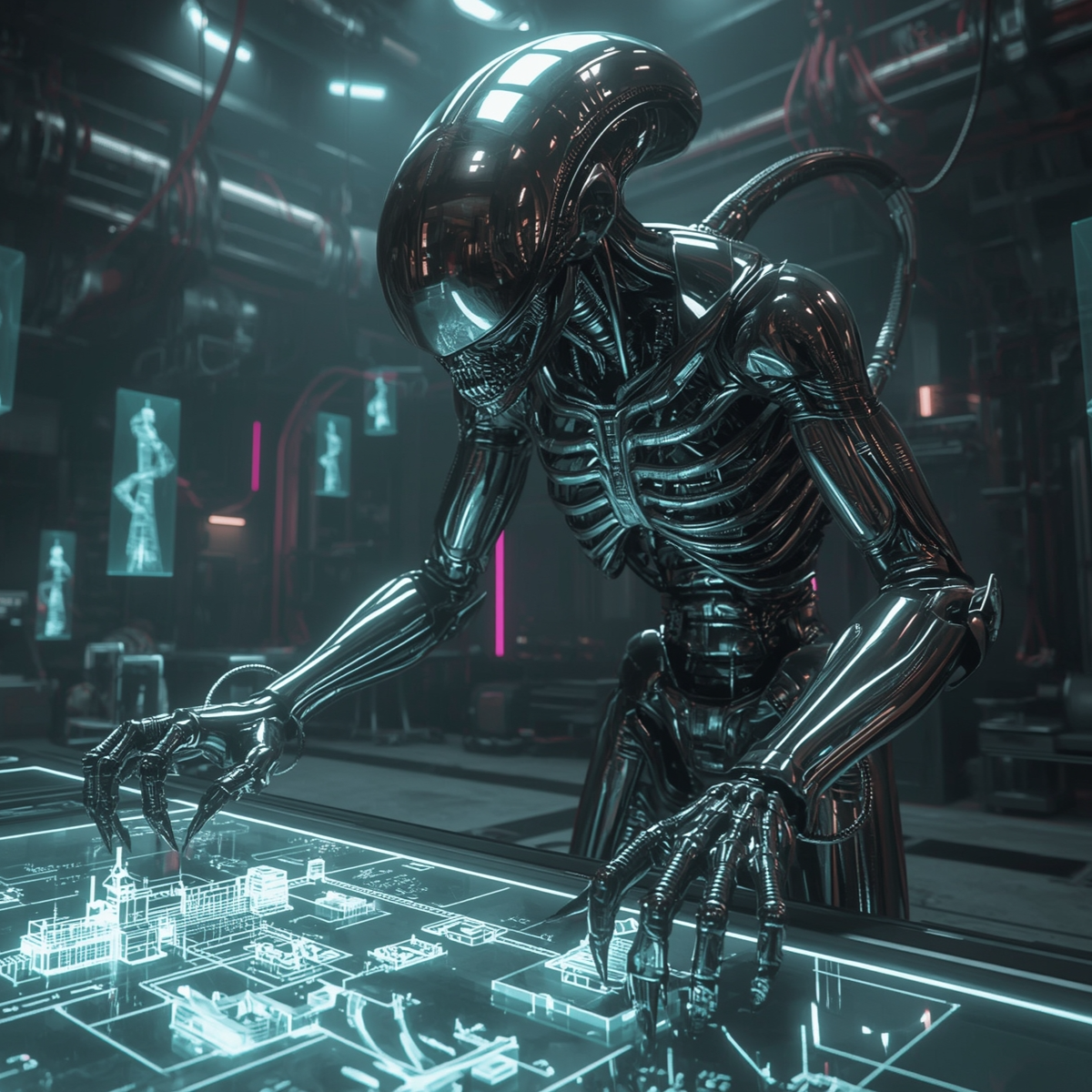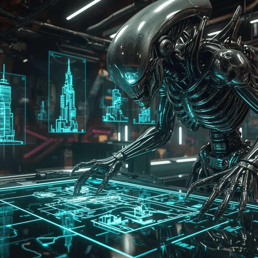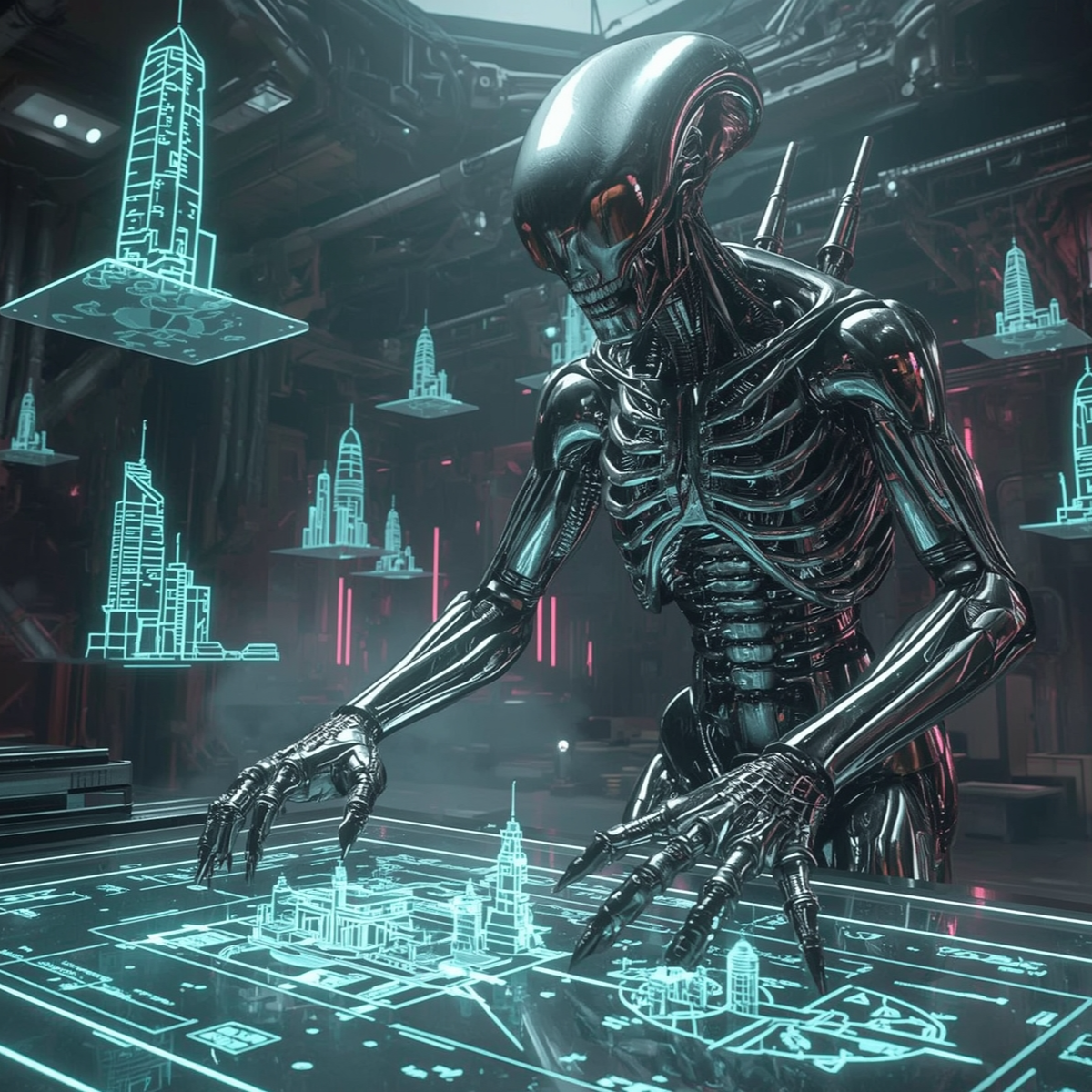 A glimpse into Humanoid Alien - where human, machine, and xenomorph fuse into titanium architect builders, ideal for working.