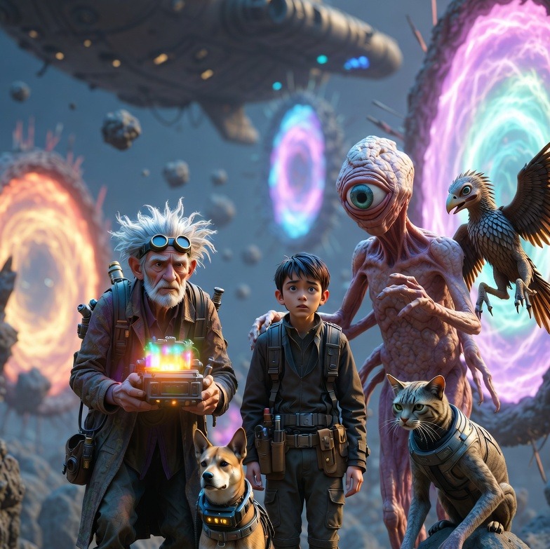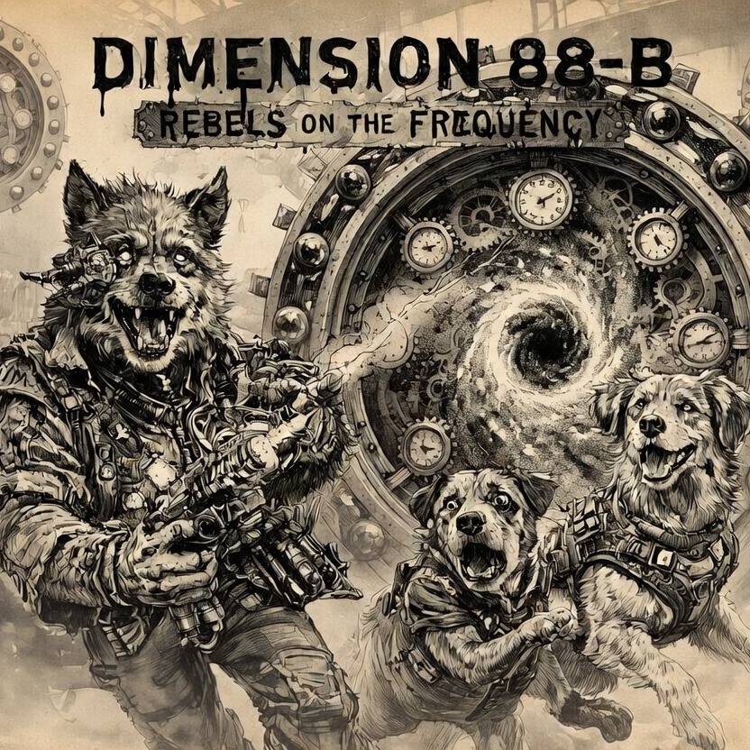 Comedy sci-fi metal fused with dark steampunk orchestral industrial, fast-paced and chaotic with multiverse humor, featuring heavy distorted guitars and aggressive industrial drums layered over a mechanical clockwork rhythm of cog clicks, gear pulses, grinding metal percussion, and hissing steam textures, Incorporates a deep experimental acoustic layer using unusual instruments: octobass, contrabass balalaika, hyperbass flute, hydraulophone, gravikord, gusli, diyin ruan, ashbory bass, cimbasso, serpent, contrabass clarinet, santour, hurdy-gurdy, ravanahatha, bass harmonica, melodica, vibra slap, colossal gongs, bodhran, contrabass flute, lithophone, bullroarer, tarogato, and heckelphone—blended into a dark, gritty, cinematic soundscape, Driven by 80s analog synth bass, arpeggiators, atmospheric pads, and glitchy portal sound effects, creating an intense interdimensional sci-fi atmosphere
