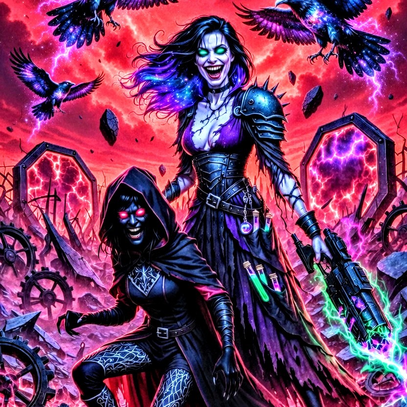 Extreme gothic symphonic black metal meets chaotic comedy sci-fi metal; high-pitched shrieks, guttural growls, anguished screams, and dual mad scientist + anxious stuttering voices; fast tremolo-picked guitars, melodic minor/diminished riffs, heavy distorted bass, blast-beats, double-kick drums, industrial drums, punchy hip-hop rhythms, 80s analog synth bass, arpeggiators, symphonic strings/choirs/harpsichords, cosmic pads, glitchy portal SFX; sinister, macabre, cinematic, chaotic, interdimensional humor, vampiric horror, apocalyptic multiverse, nightmarish landscapes; dense, layered, epic crescendos, theatrical, chaotic yet controlled aggression, cathedral-like reverb, melodic darkness meets absurd sci-fi energy
