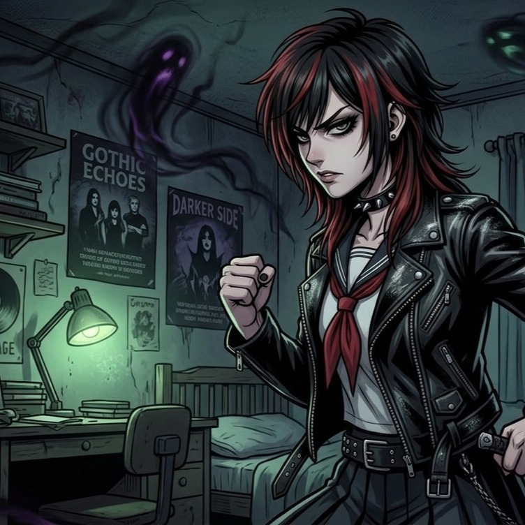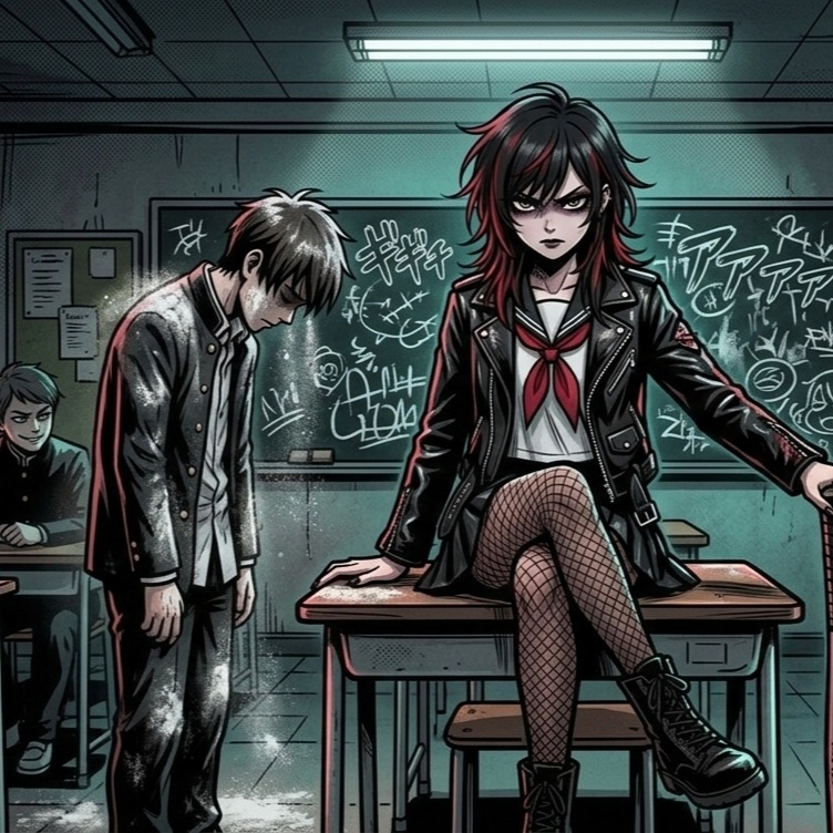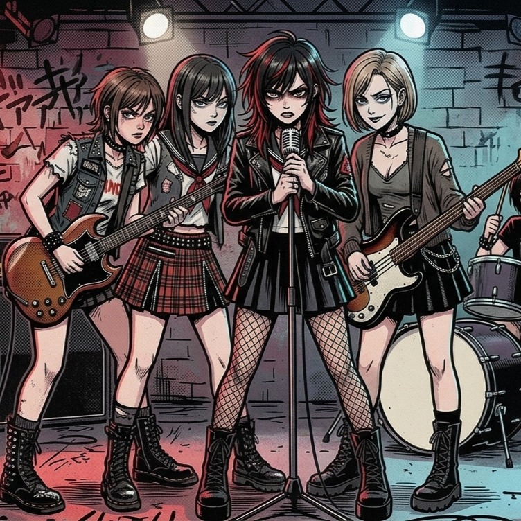 Japanese 80s street punk rock, raw distorted guitar riffs, punchy bass, driving drums, tense rebellious atmosphere, fast-tempo aggressive groove, chant-like chorus energy, BPM200, Versatile female vocal, balanced mid-range tone, clear but slightly edgy texture, dynamic control, expressive phrasing, strong chorus lift without excessive screaming