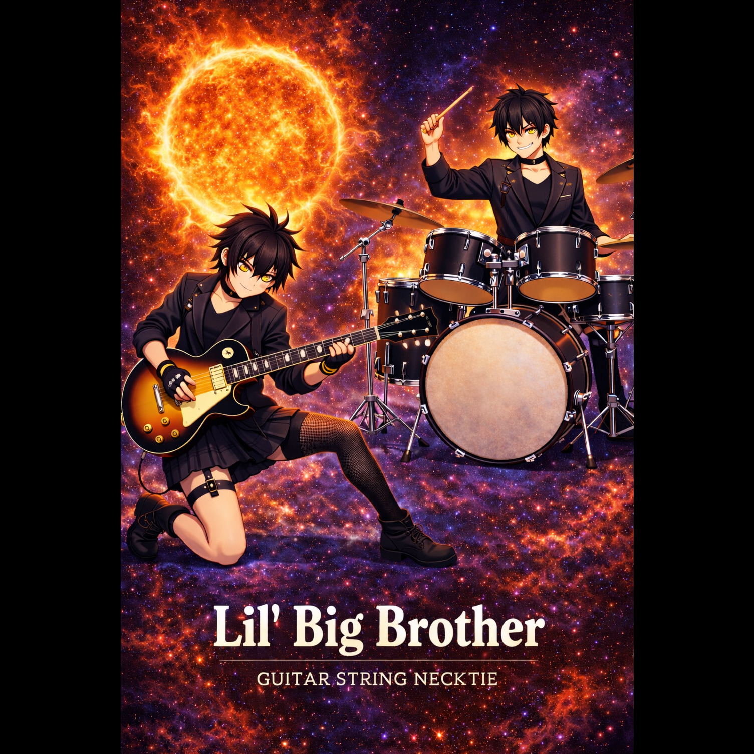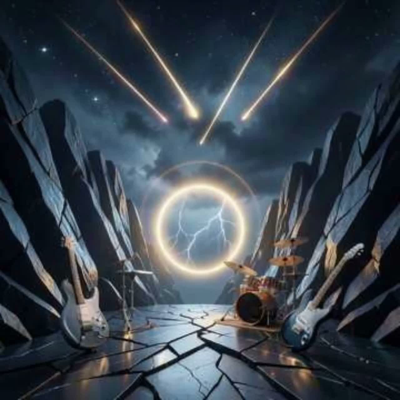 This heavy rock/metal track roars in with a searing Phrygian guitar run, pounding E5–C5–D5 power chords, deep organ pads, and explosive tom+China fills, Verses drive with chugging guitars, locked bass/drums, and clean harmonized leads for tension, Choruses swell with open chords, expressive melodic leads, lush organ, and synth strings for gothic atmosphere, The second verse intensifies via dual guitars, ghost snares, and melodic bass, A dramatic half-time bridge brings reverb-heavy tremolo-picked solos, phaser, and harmonics, The final chorus climaxes with solo call-and-response and surging organ, Outro: gradual riff slowdown, guitar harmonic with delay, church bell and distant thunder, closing on a long E5 power chord with sustained feedback