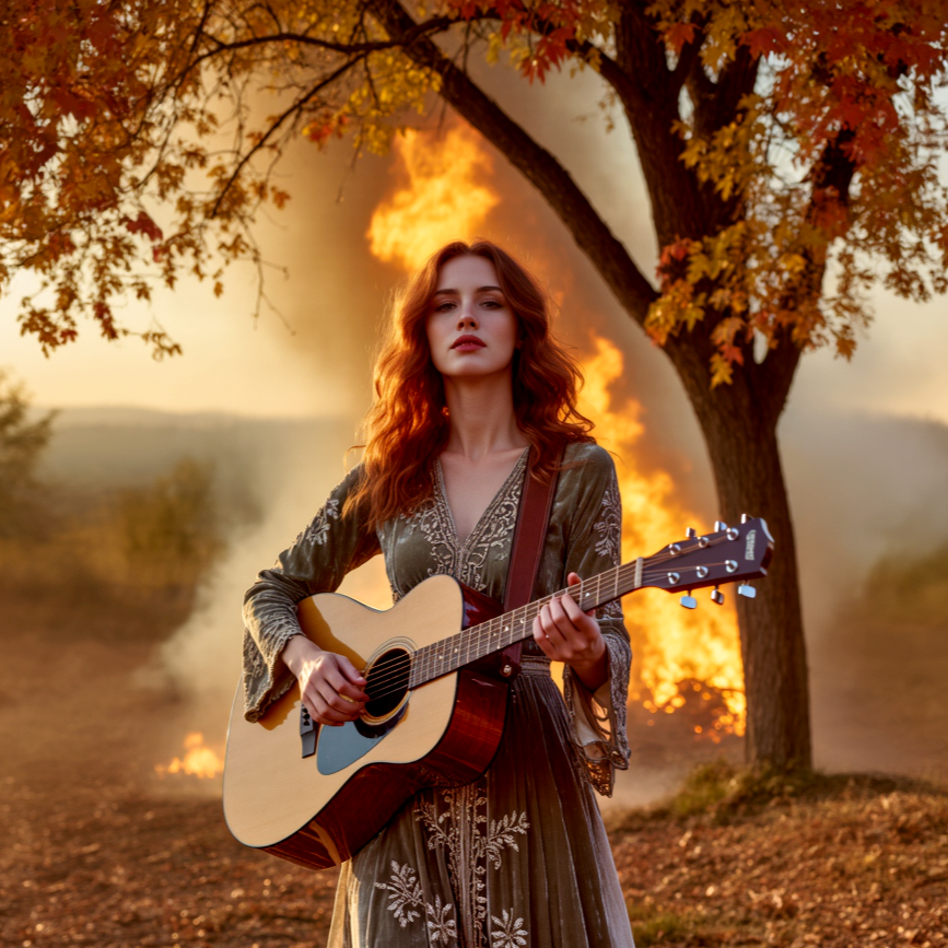 A melancholic and autumnal progressive folk-rock track; acoustic-driven, with clean vocals; built on intricate, layered acoustic guitars, the vintage sound of a Mellotron, and melodic, jazz-inflected basslines; the atmosphere is sorrowful, nostalgic, and deeply textured, with a focus on harmony and dynamic subtlety; the sound of a fading memory on a cool autumn evening, Genre Tags: Progressive Rock, Folk Rock, 70s Prog, Acoustic, Melancholic, Art Rock, FX Tags: Mellotron, Analog Warmth, Plate Reverb, Tape Saturation, Natural Compression, Singer's Voice: A clear and expressive mezzo-soprano voice with subtle vibrato and dynamic phrasing, alternating between intimate whispers and breathy, airy soars, Mastering: Lo-fi polish with tape-like warmth, layered reverb, and slightly compressed midrange to maintain emotional intensity and rawness, Performed by Amanda Magellan